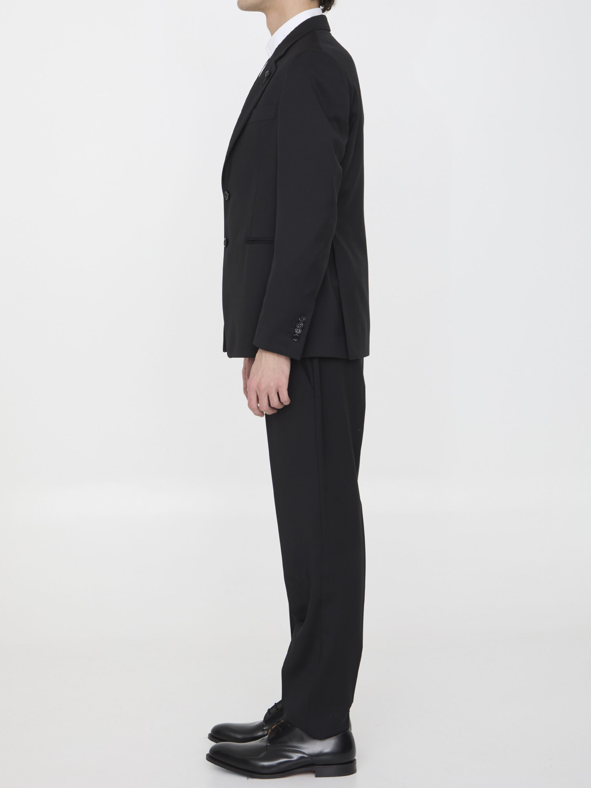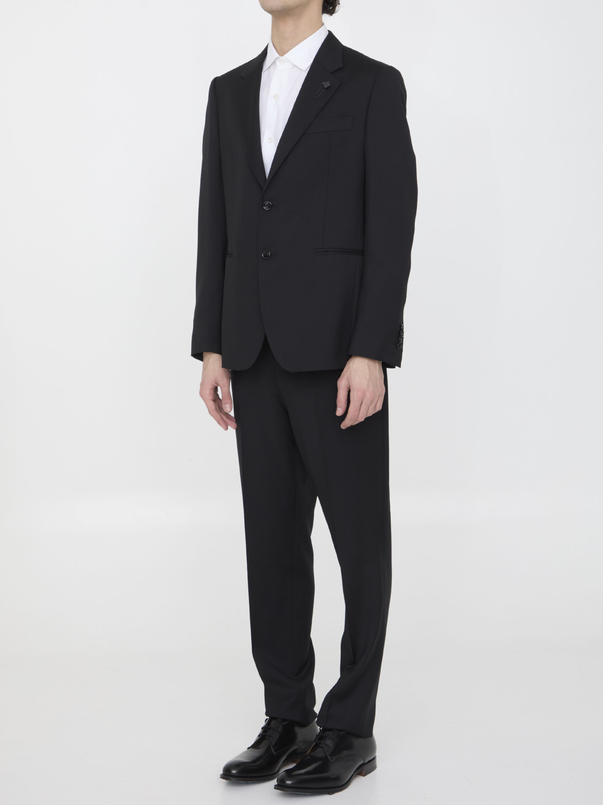 Two-piece suit in black wool. The jacket features classic lapels with brooch on lapel, single-breasted closure, two front welt pockets, a welt pocket on chest and buttoned cuffs. Straight-leg trousers with zip and button closure, two side welt pockets, two rear buttoned welt pockets and belt loops. Regular fit.