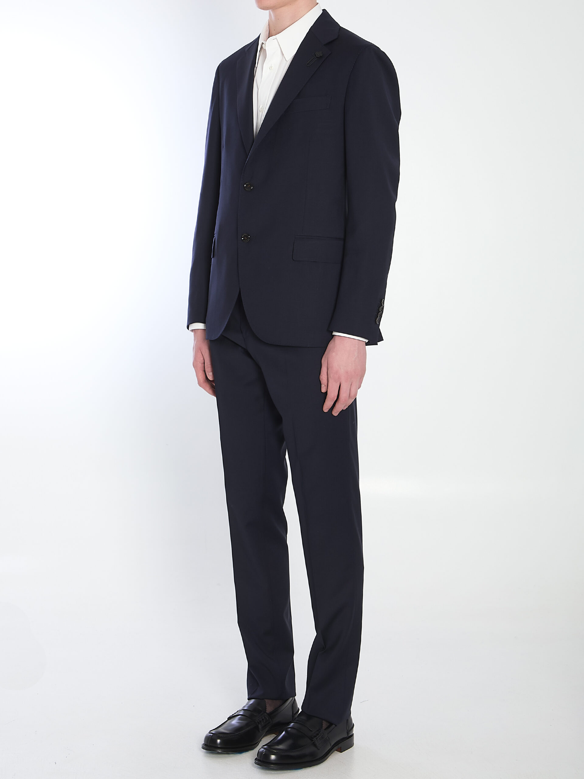 Two-piece suit in dark blue virgin wool. The single-breasted jacket features classic lapels with a lapel pin, front button closure, two front flap pockets, a welt pocket on the chest, buttoned cuffs, and two flat internal pockets. The straight-leg trousers feature a zip and button closure, two side pockets, two back welt pockets with a button, and belt loops. Regular fit.