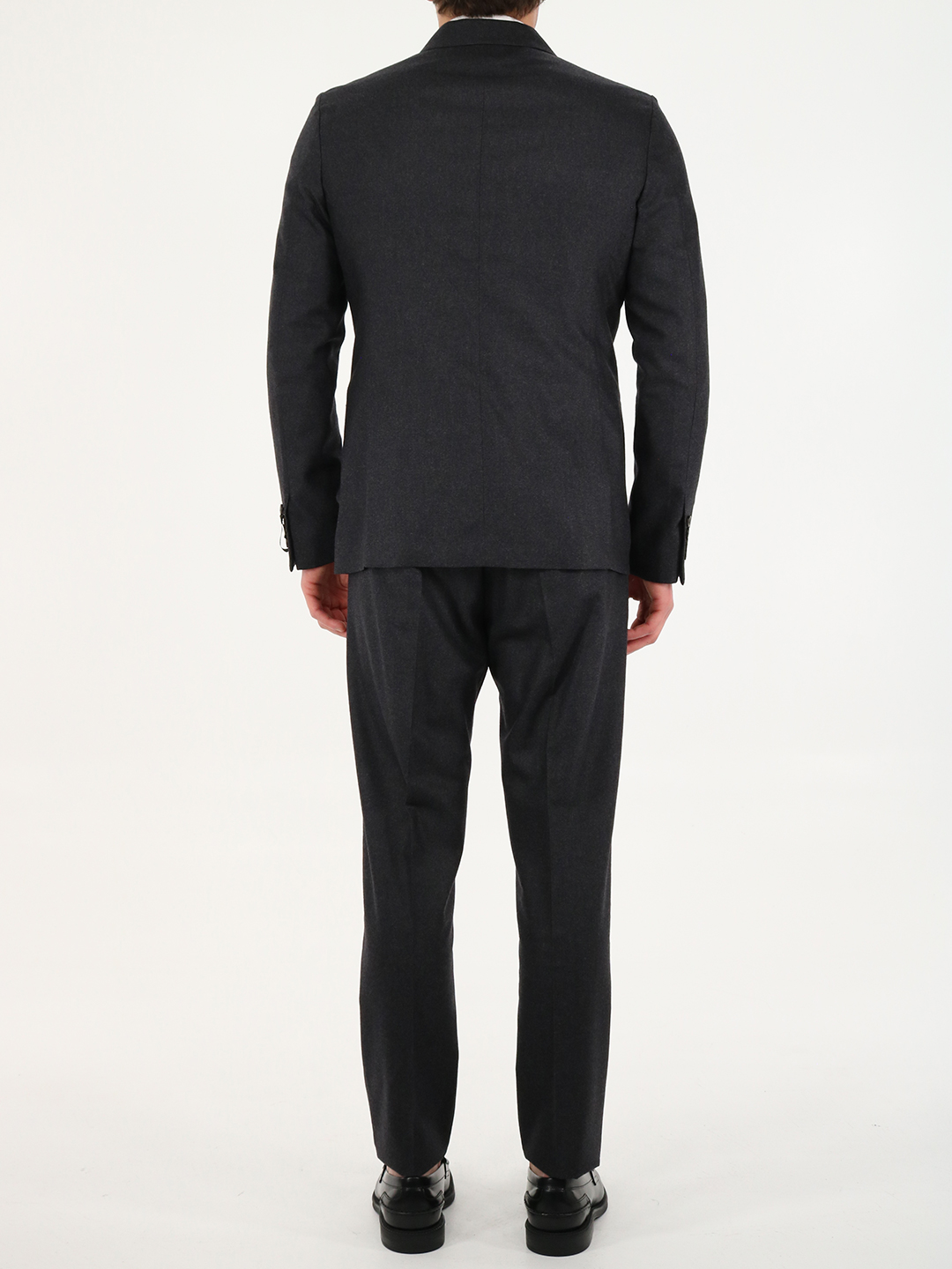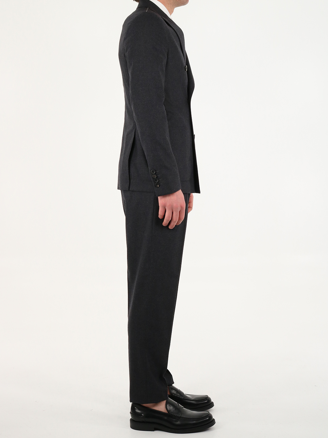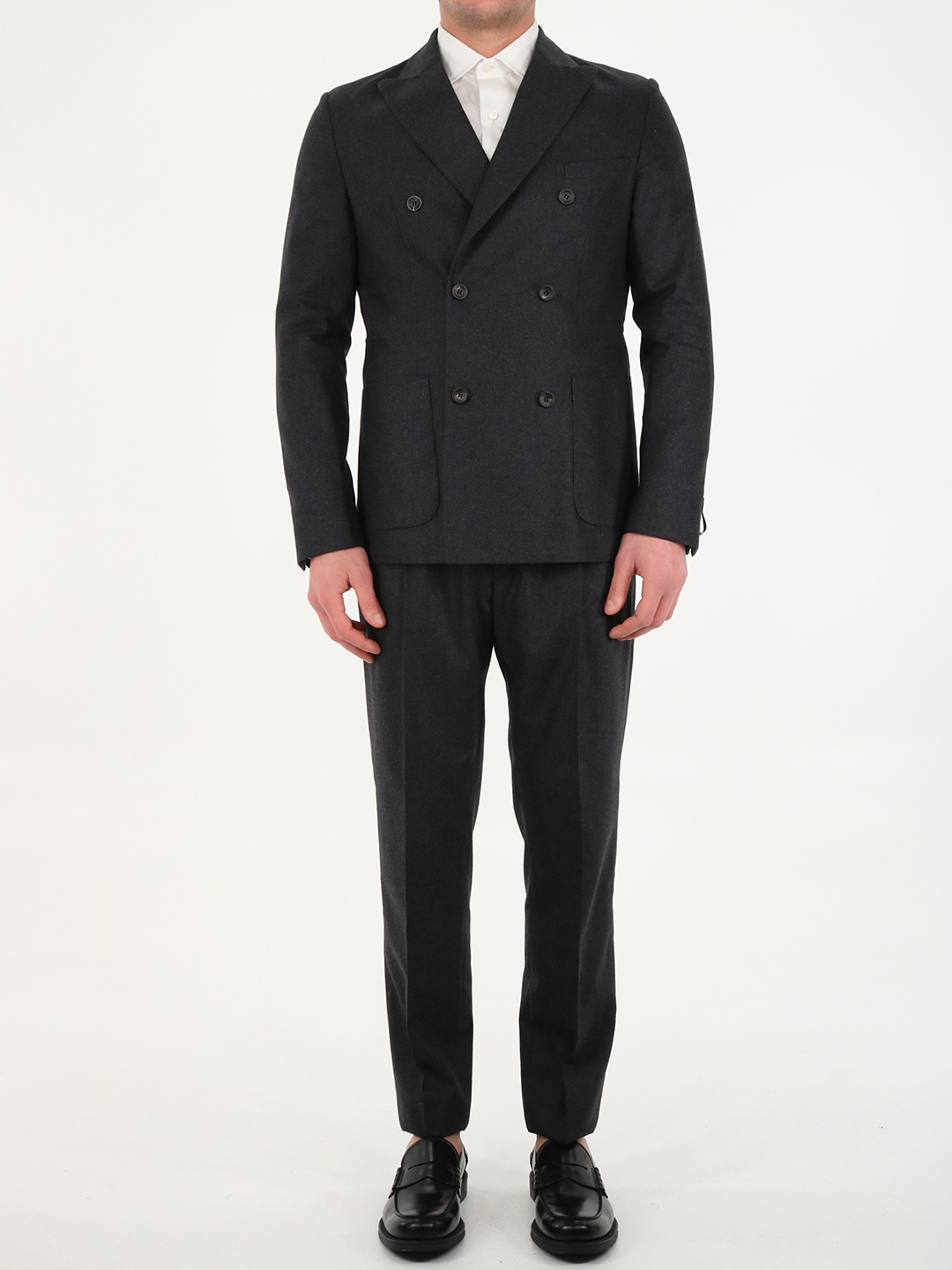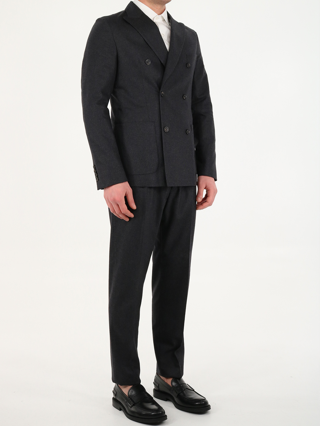 Anthracite grey suit in wool flannel. It features double-breasted blazer, chest pocket, two side pockets, two inner pockets, buttons on cuffs and trousers with darts.