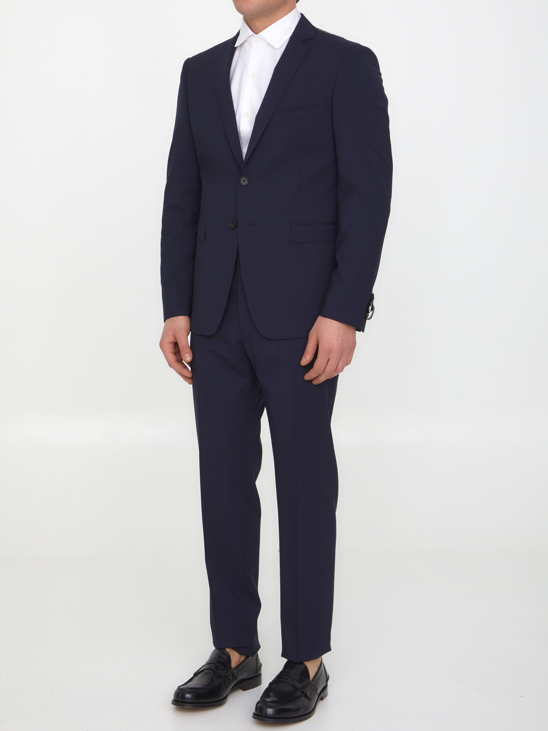 Blue virgin wool two-piece suit. Single-breasted jacket with peaked lapels, front two-button closure, two front flap pockets, a welt pocket on chest and buttoned cuffs. Straight-leg trousers with zip and hook-and-eye closure, two side welt pockets and two rear welt pockets.