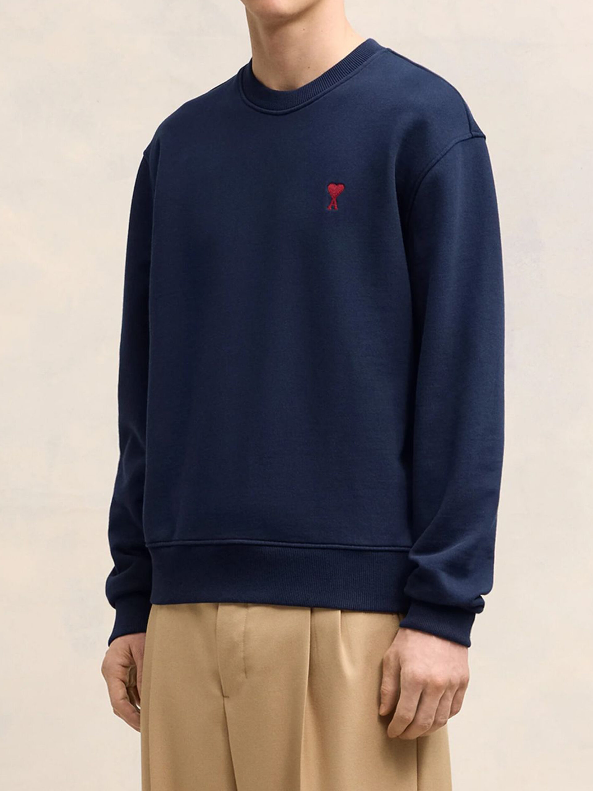 Midnight blue organic cotton loopback sweatshirt. It features a ribbed crew neck, small red Ami de Coeur logo on the chest, tone-on-tone “Ami” embroidery below the collar at the back, and ribbed hem and cuffs. Regular fit.