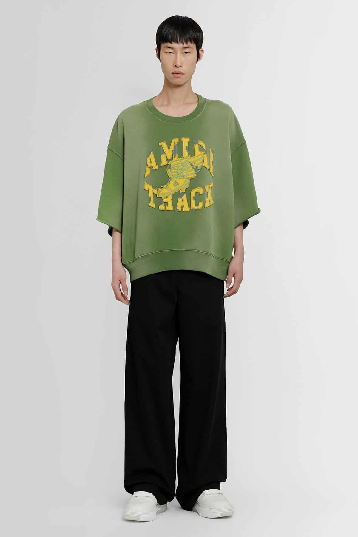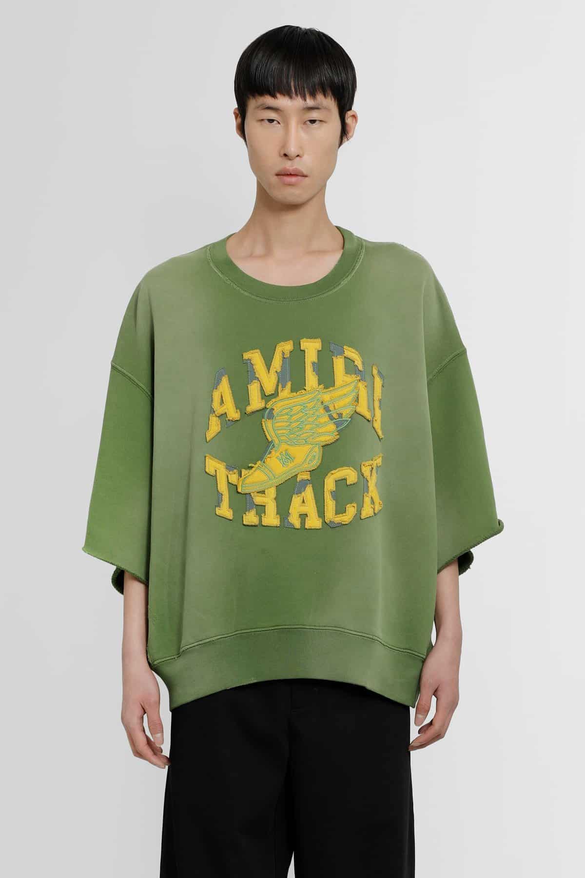 Verde Vintage treatment Crewneck Front amiri track patches Dropped shoulders Short sleeves Ribbed hem and cuffs Oversized fit