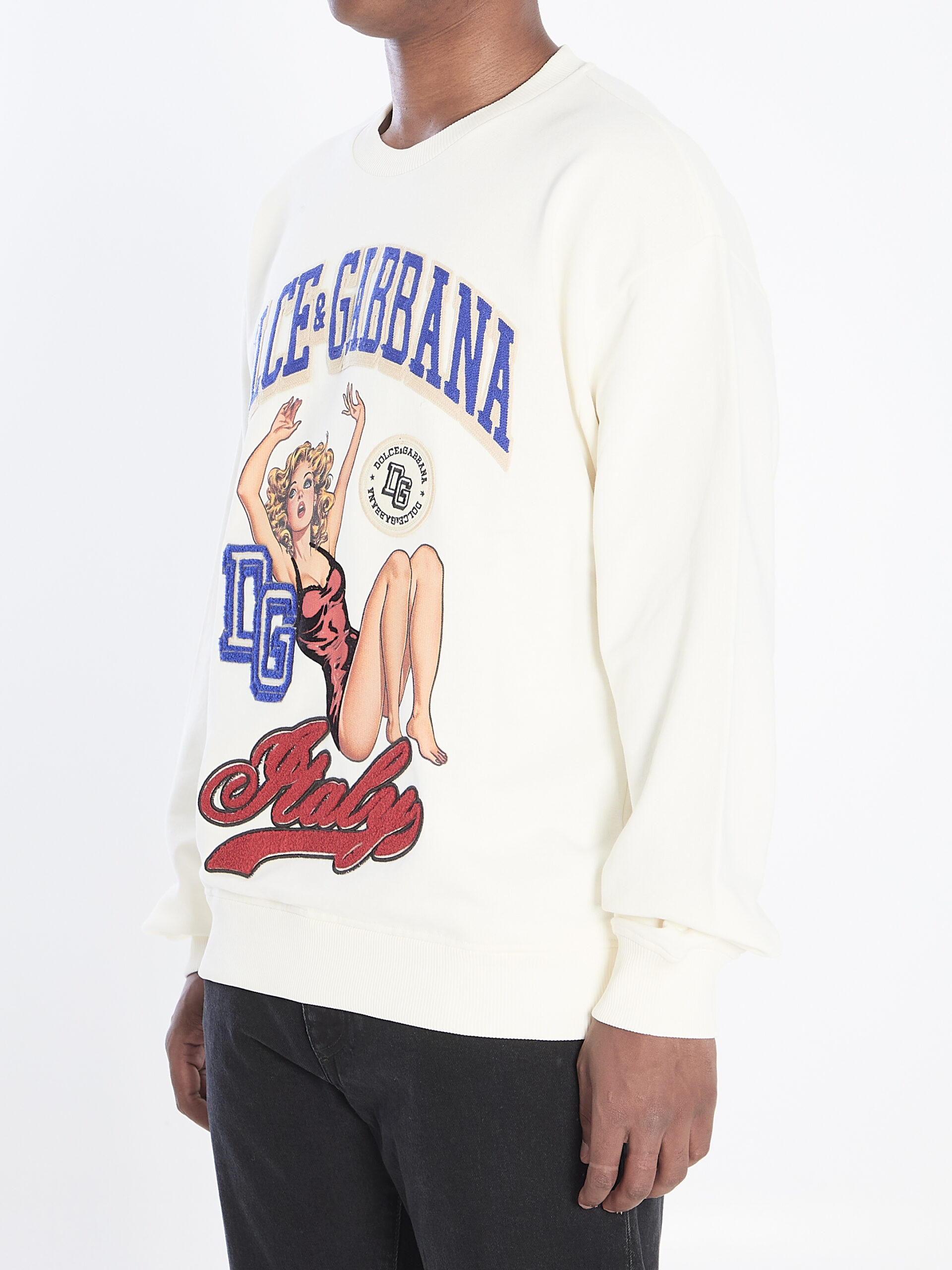 Sweatshirt in cotton jersey in ivory. Features ribbed crew neck, long sleeves, Pin-up print with appliqués on the front, embroidered Dolce&Gabbana signature, ribbed hem and cuffs. Regular fit.