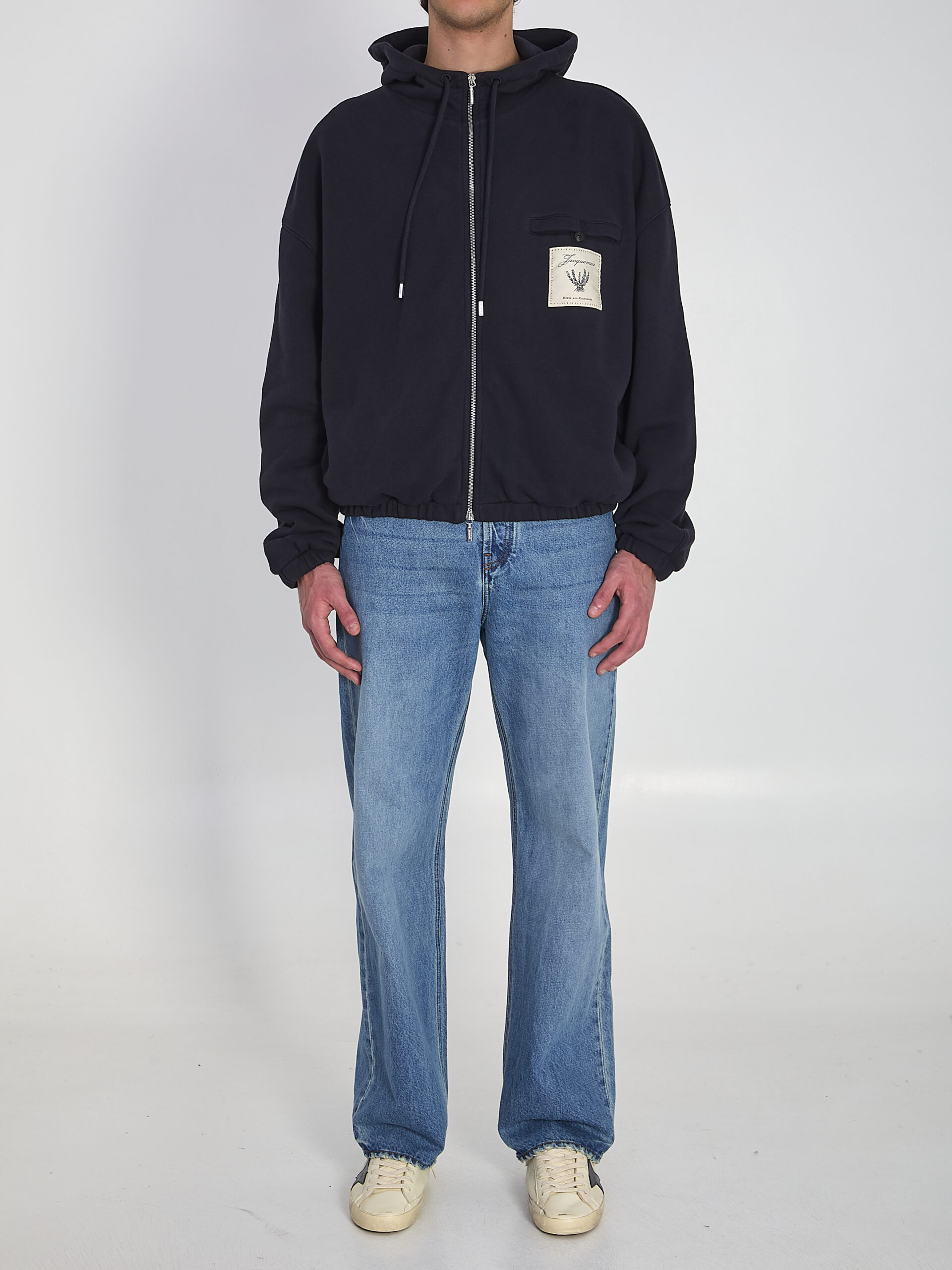 Navy blue sweatshirt in brushed cotton fleece. Features a hood with a drawcord, a front dual slider zipper closure, a button-up jacquard pocket with a J loop on the chest, an embroidered Rosemary logo applique, side seam pockets, an embroidered logo applique on the back, and elasticized cuffs and hem. Slightly cropped model. Oversized fit.