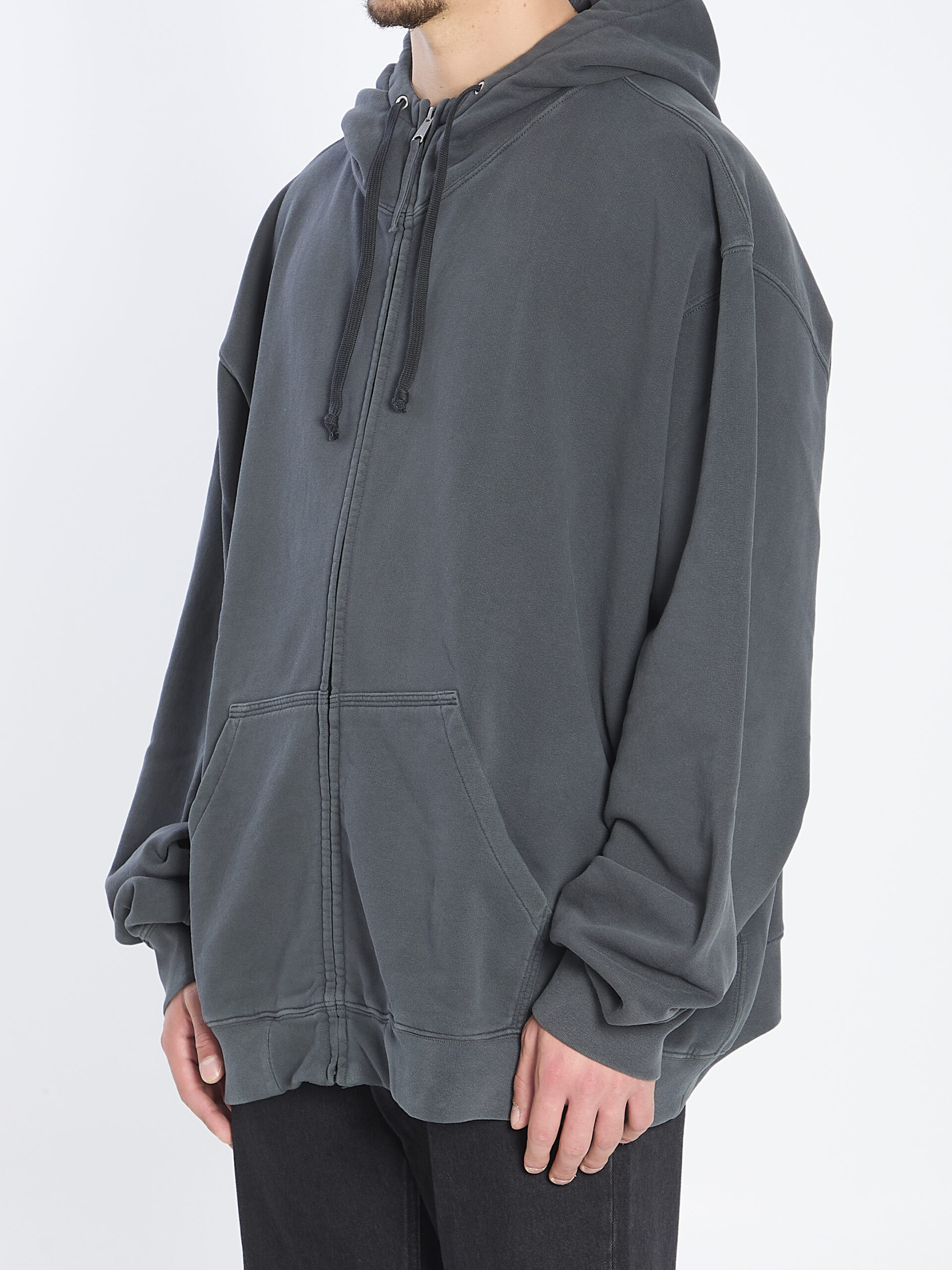 Dark grey cotton jersey sweatshirt. Features a fabric drawstring hood, front zip fastening, two front kangaroo pockets, numeric logo, and the iconic Four Stitches on the back. Oversized fit.