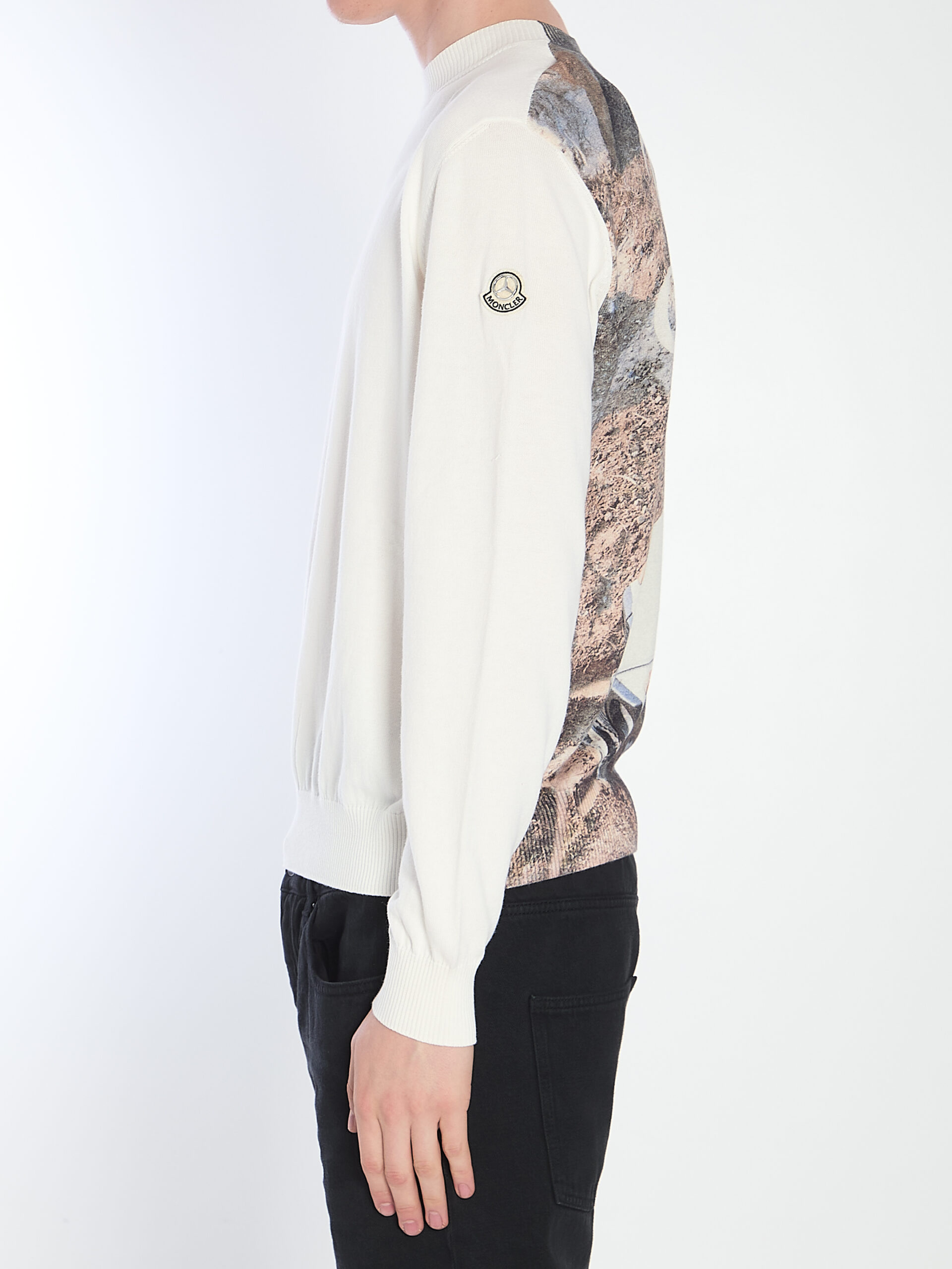 Moncler x Mercedes-Benz by Nigo crew-neck sweater in white flat-knit cotton. It features a logo and car print on the back, a Moncler x Mercedes-Benz patch on the left sleeve, and ribbed crew neck, cuffs, and hem. Regular fit.