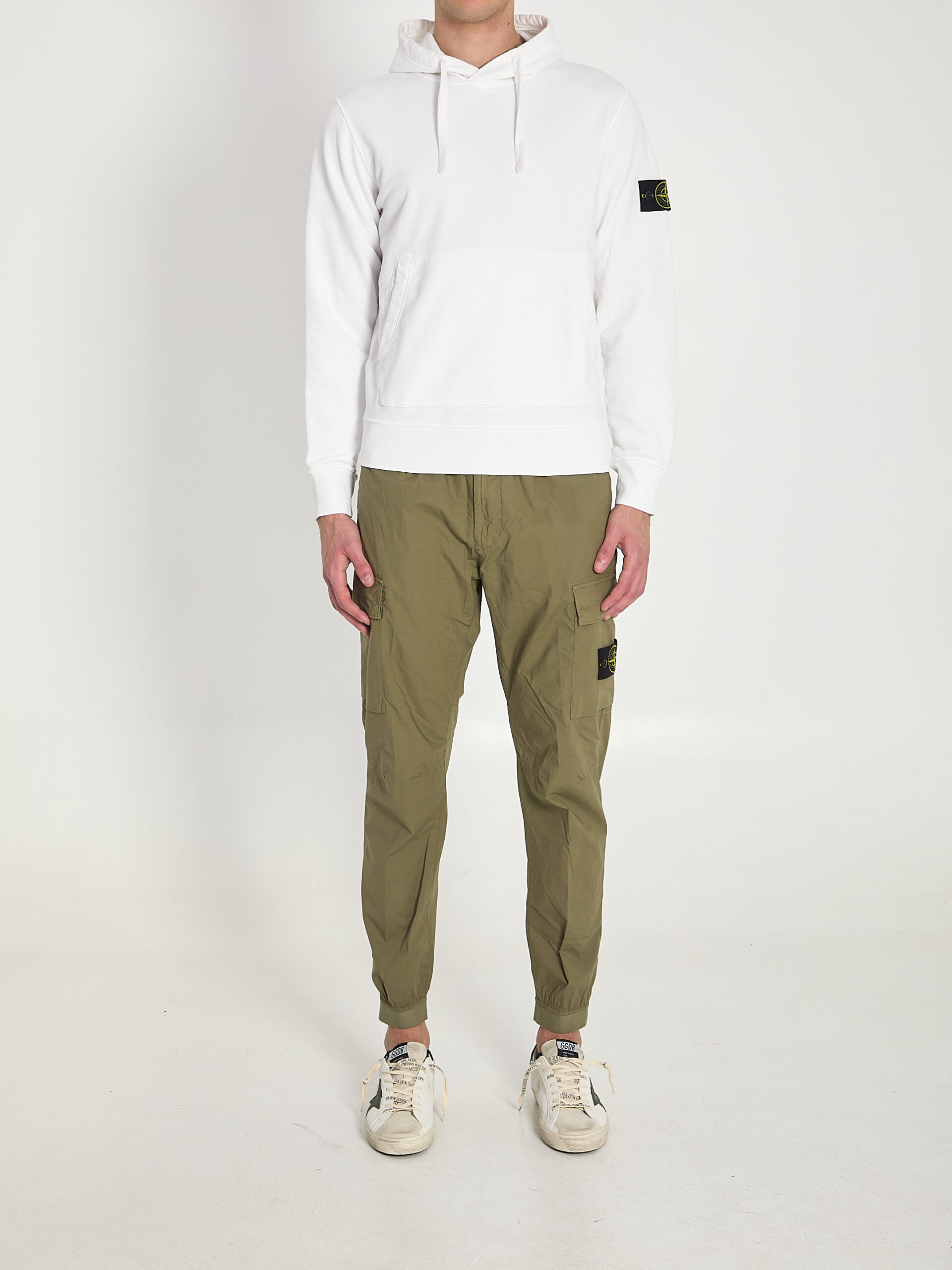 White cotton hoodie. It features a drawstring hood, long sleeves, an iconic applied badge on the sleeve, a front kangaroo pocket, and ribbed cuffs and hem. Regular fit.