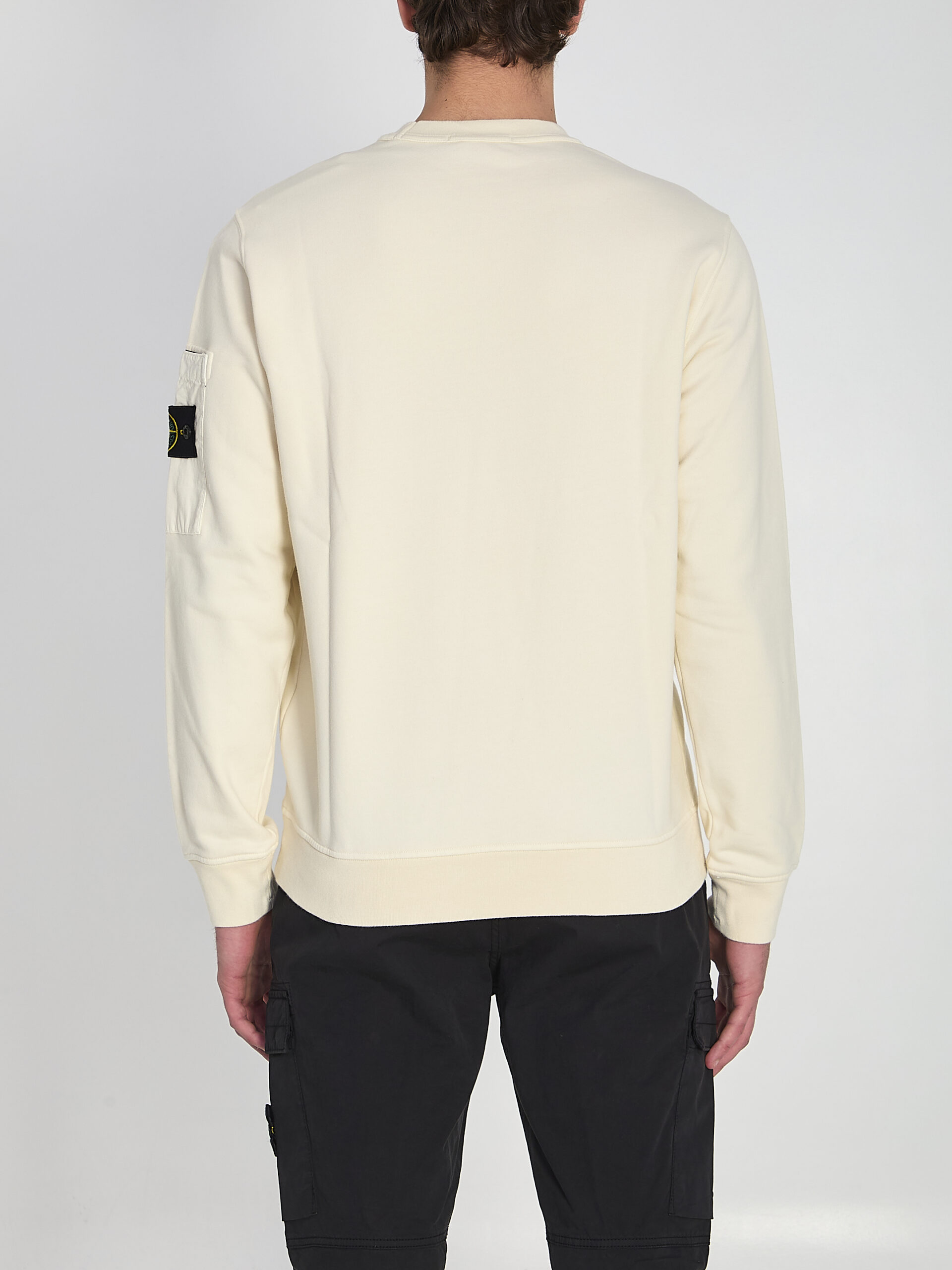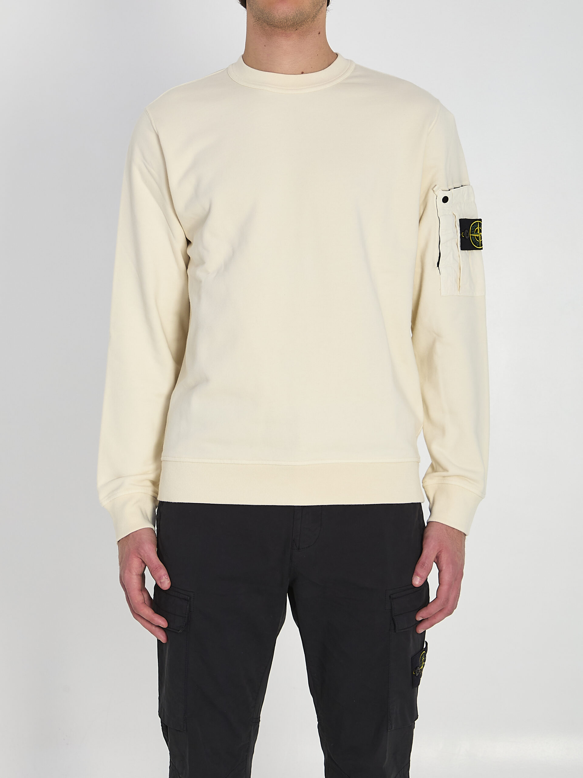 Ivory white organic cotton sweatshirt. It features a ribbed crew neck, long sleeves, an iconic badge appliquéd on the sleeve, a snap-fastening sleeve pocket, and ribbed cuffs and hem. Regular fit.