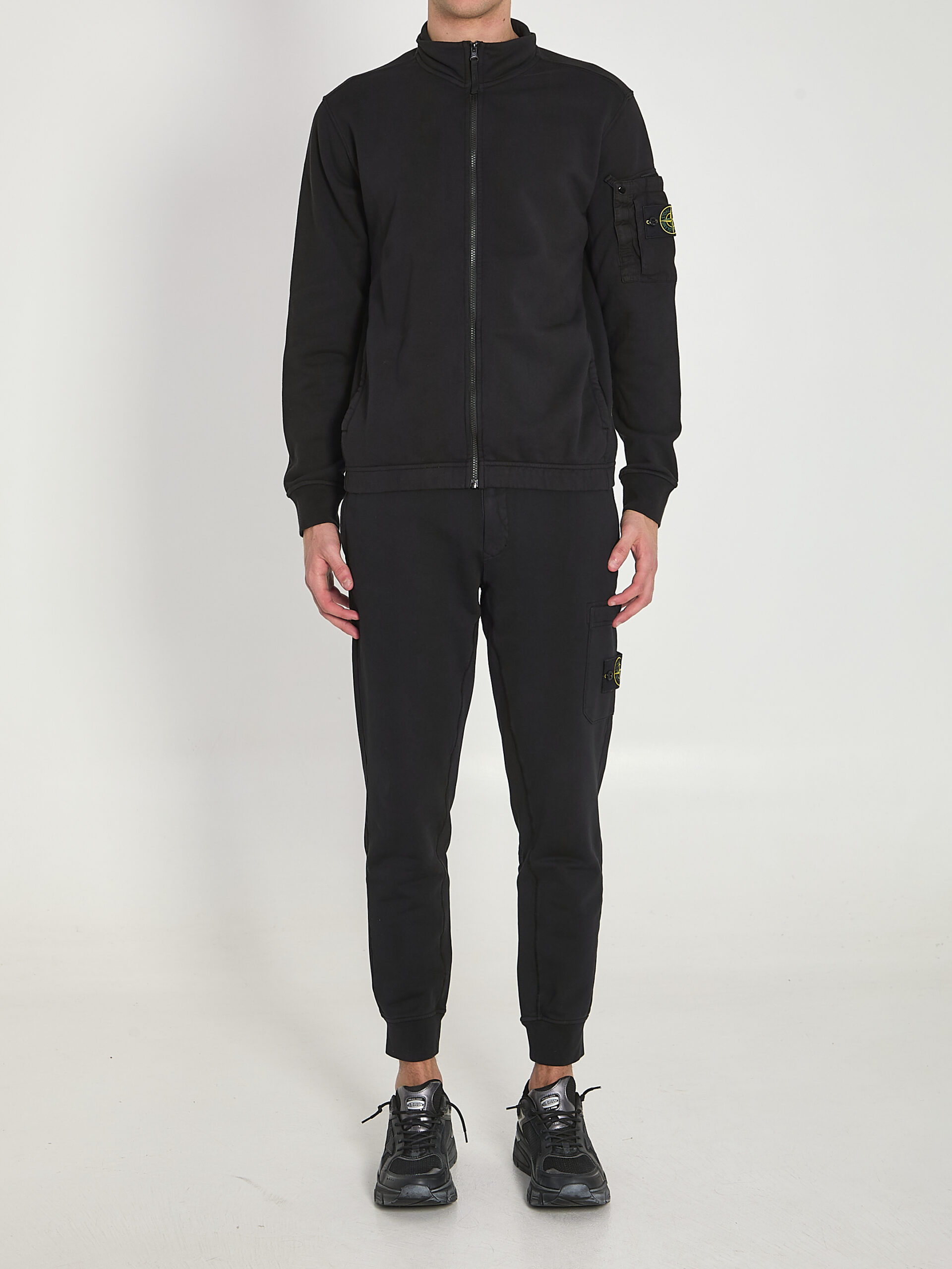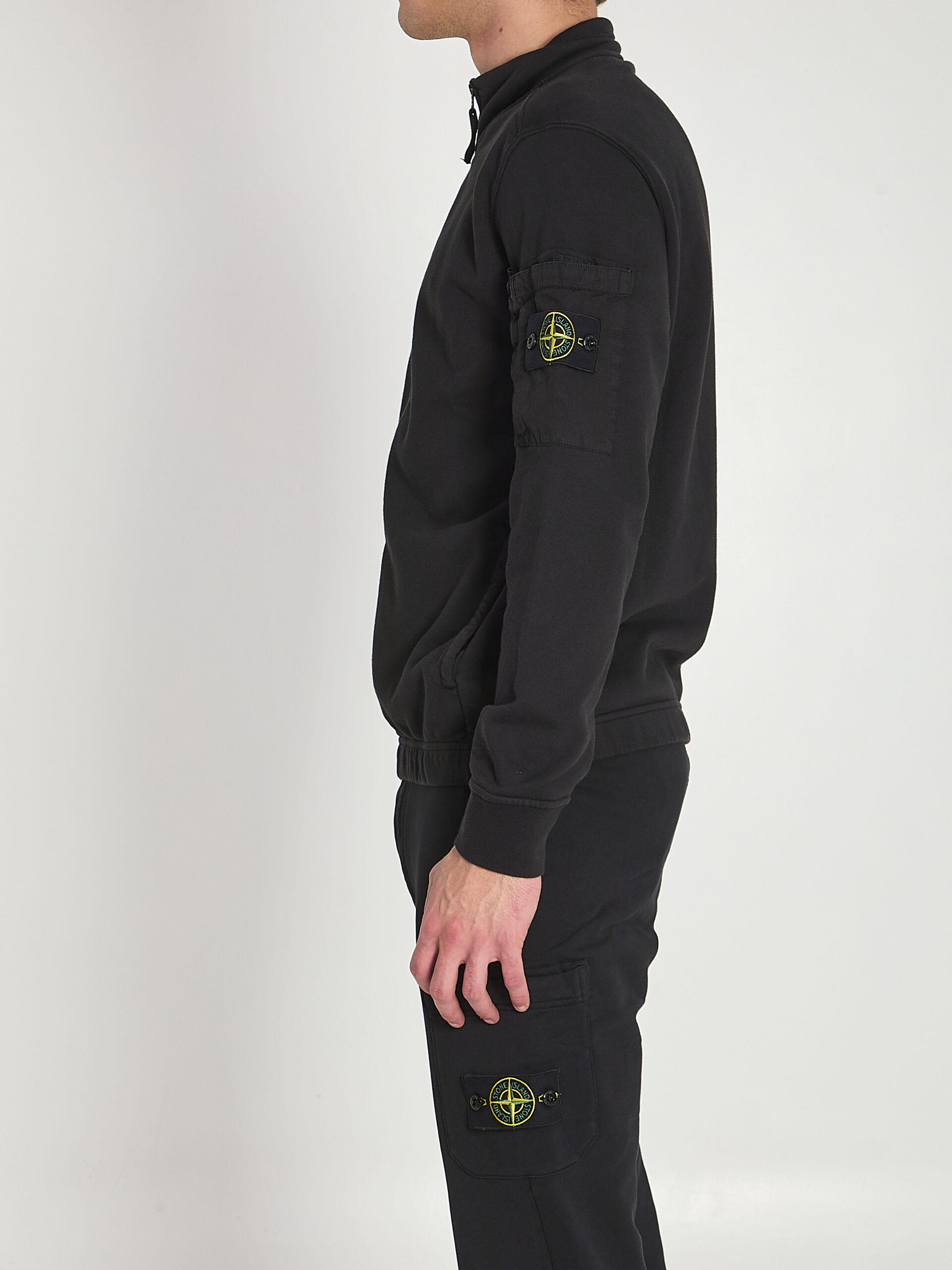 Black cotton sweatshirt. Features a high collar, front zip closure, long sleeves, a pocket with button and Velcro on the sleeve with iconic badge, and two front pockets. Regular fit.