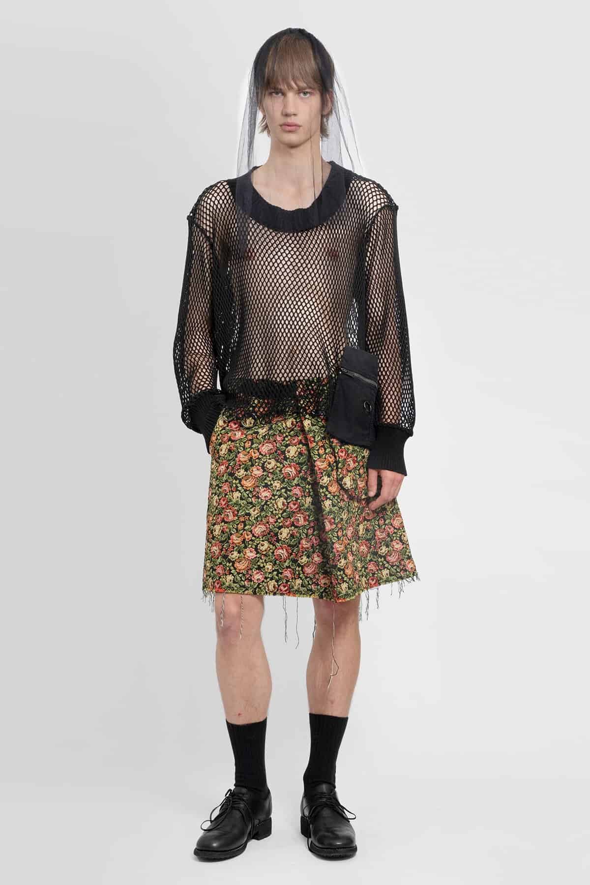 Black Net knit Crewneck Dropped shoulders Ribbed cuffs Destroyed hem