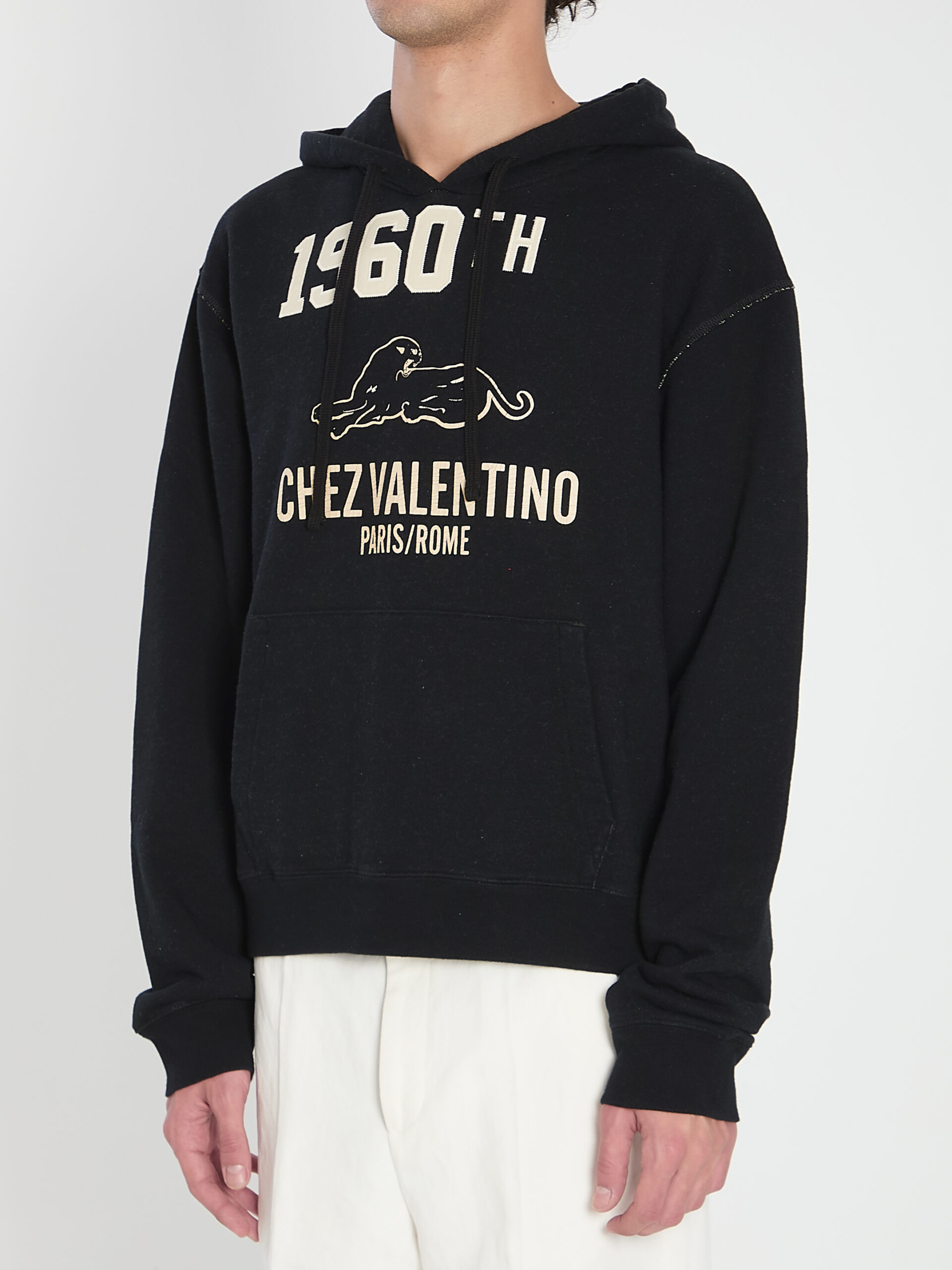 Sweatshirt in black cotton blend. Features long sleeves, front Chez Valentino embroiderycream color, a single central pocket, a subtle “used” effect, and a hood.