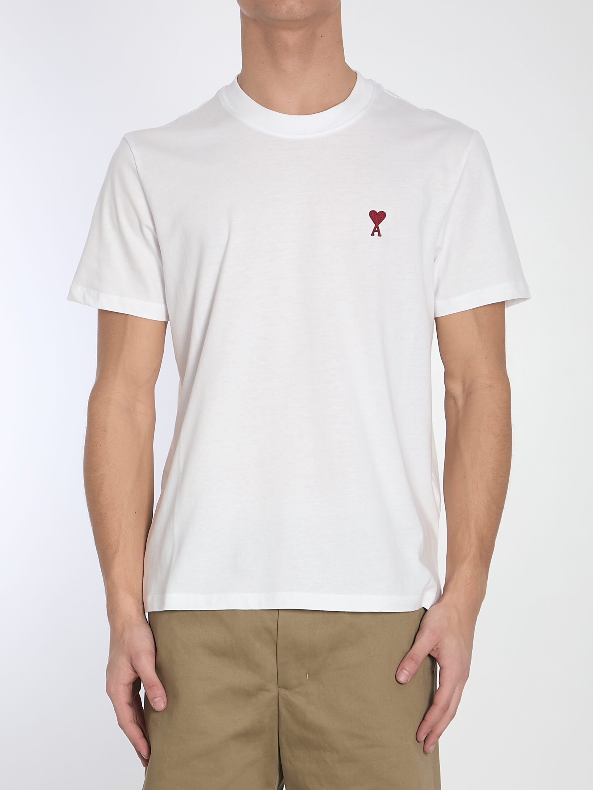 White cotton short-sleeve crewneck t-shirt. It features a red embroidered Ami de Coeur logo on the chest and a ribbed crewneck. Regular fit.