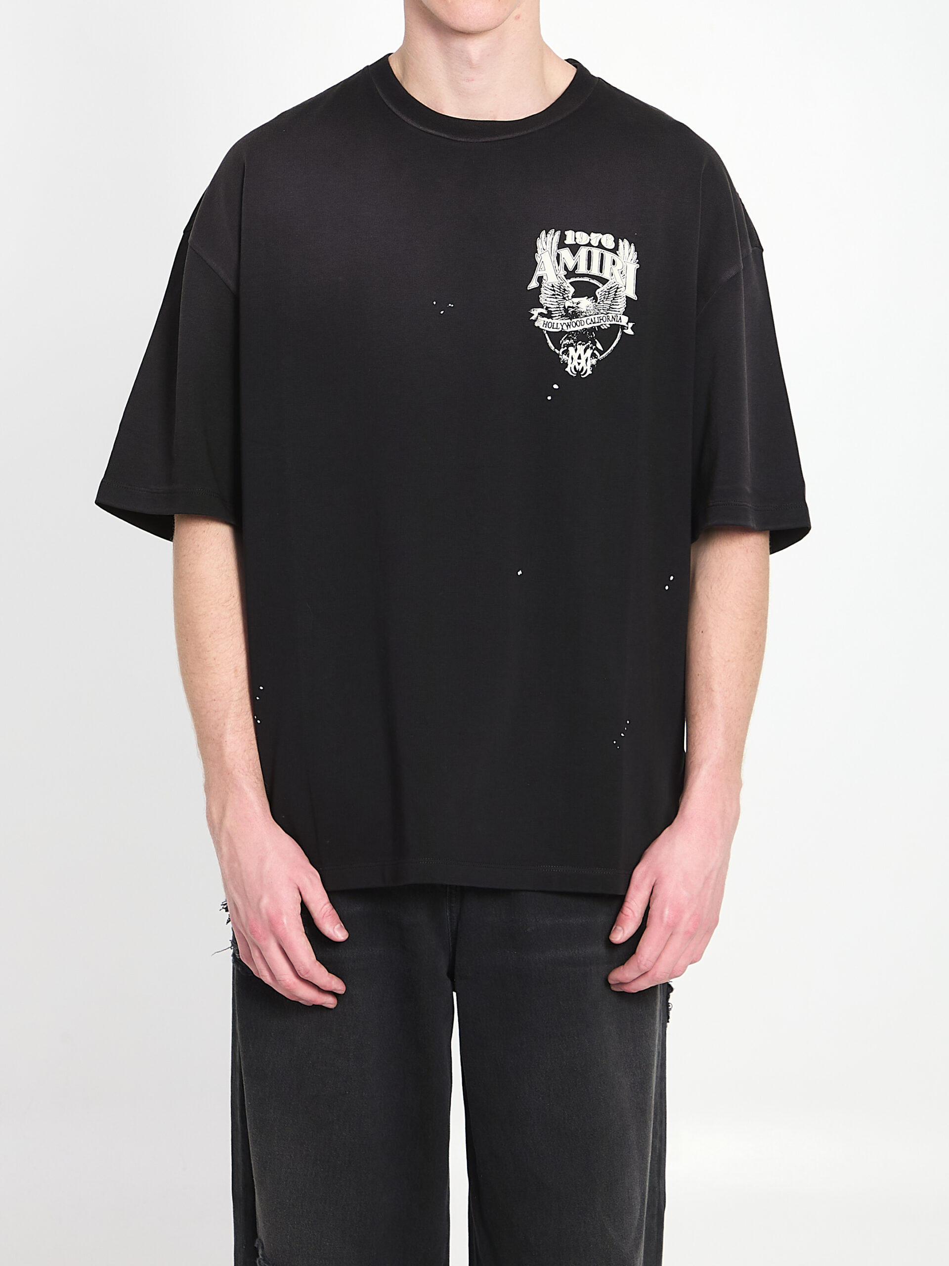 Black cotton jersey t-shirt. Features a crew neck, short sleeves, Eagle graphic on the chest and back, distressed effect. Loose fit.