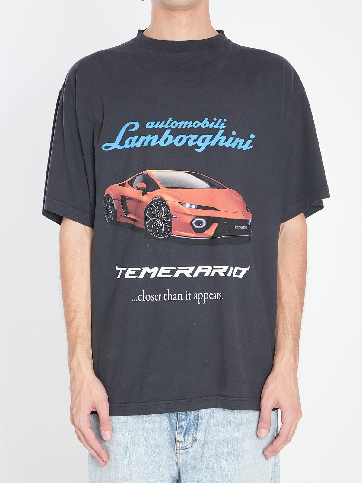 Black dry cotton jersey T-shirt. Features a crew neck, short sleeves, and a printed Lamborghini tee motif on the front and back. Designed by Balenciaga for Automobili Lamborghini, in collaboration with Lamborghini. Oversized fit.