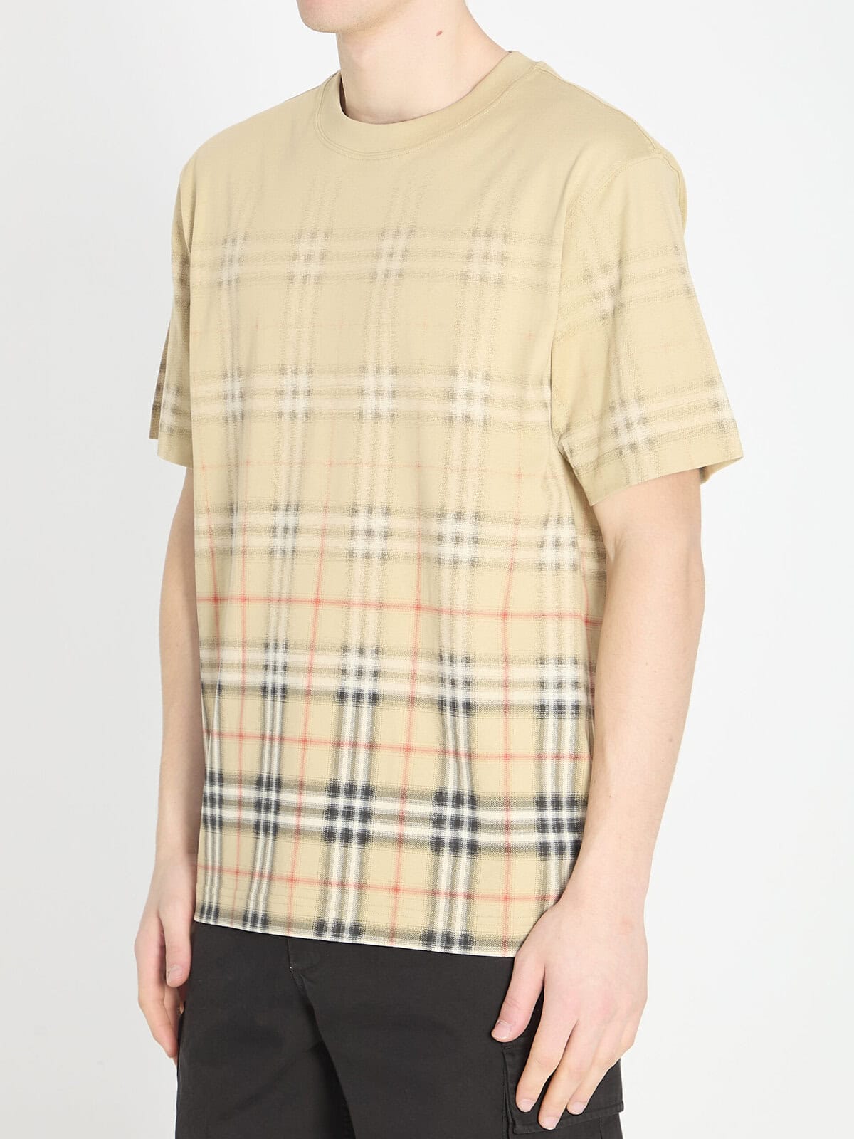 Beige sand lightweight cotton jersey T-shirt with Check fade pattern. It features a ribbed crew neck and short sleeves. Comfortable fit.