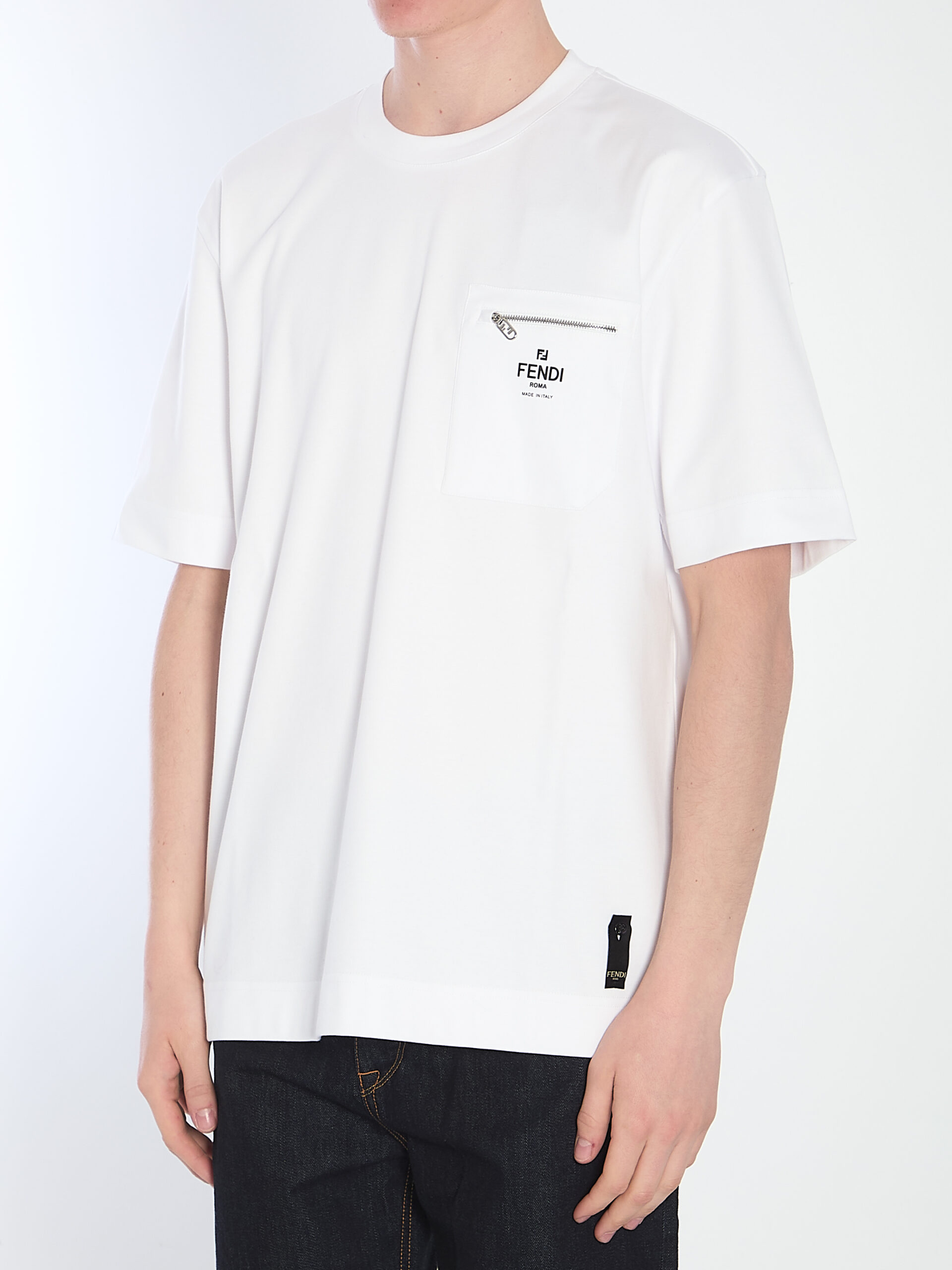 White cotton crew-neck t-shirt with short sleeves. It features a zip pocket with a black Fendi Roma logo applied on the chest, a black gusset with a Fendi logo and button at the hem, and a ribbed crew neck. Oversized fit.