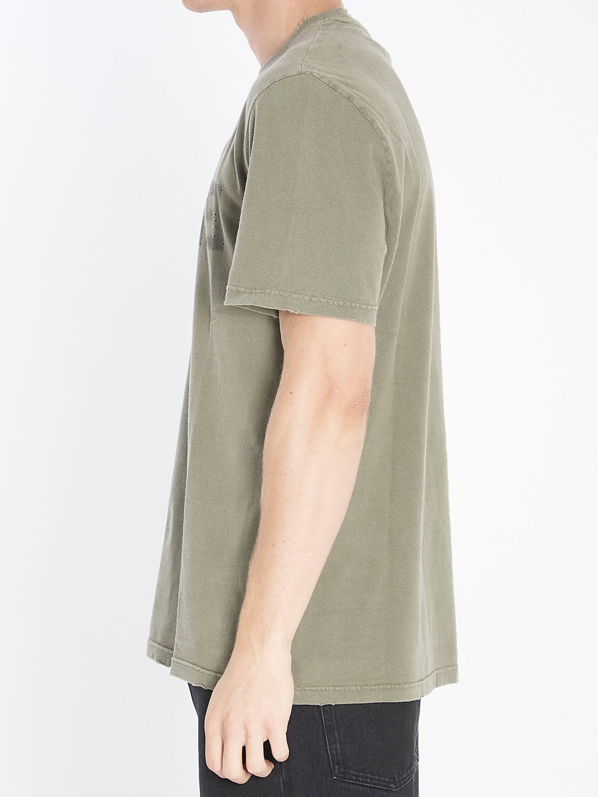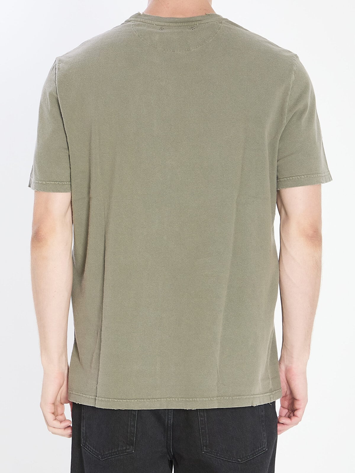 Olive green brushed cotton jersey T-shirt. Featuring a crew neck, short sleeves, reversed Golden print on the front, star logo on the back, and ribbed finish. Distressed effect. Regular fit.