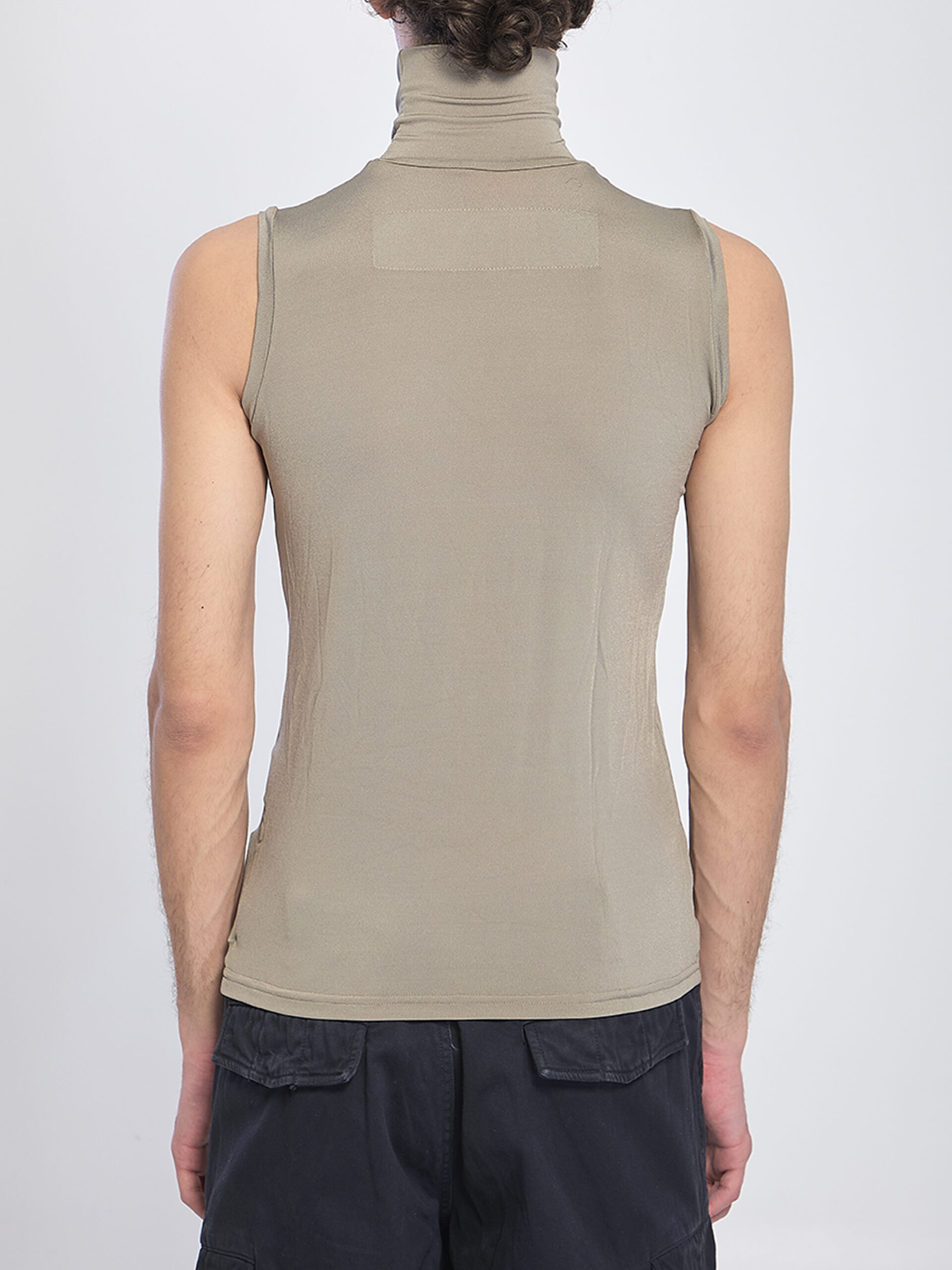 Sleeveless high-neck top in grey stretch technical fabric. Any imperfections are considered natural signs of wear over time.