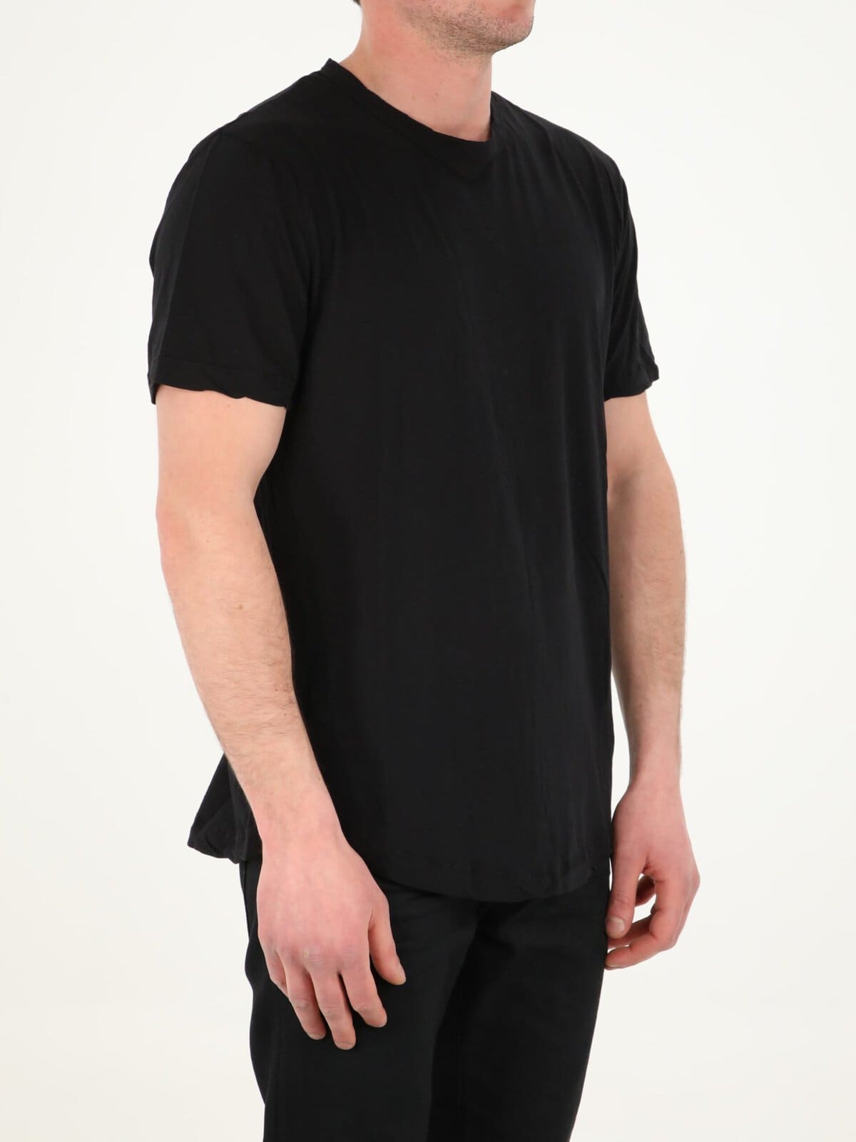 Black cotton t-shirt. Features a ribbed crew neck, short sleeves, rounded hem. Regular fit.