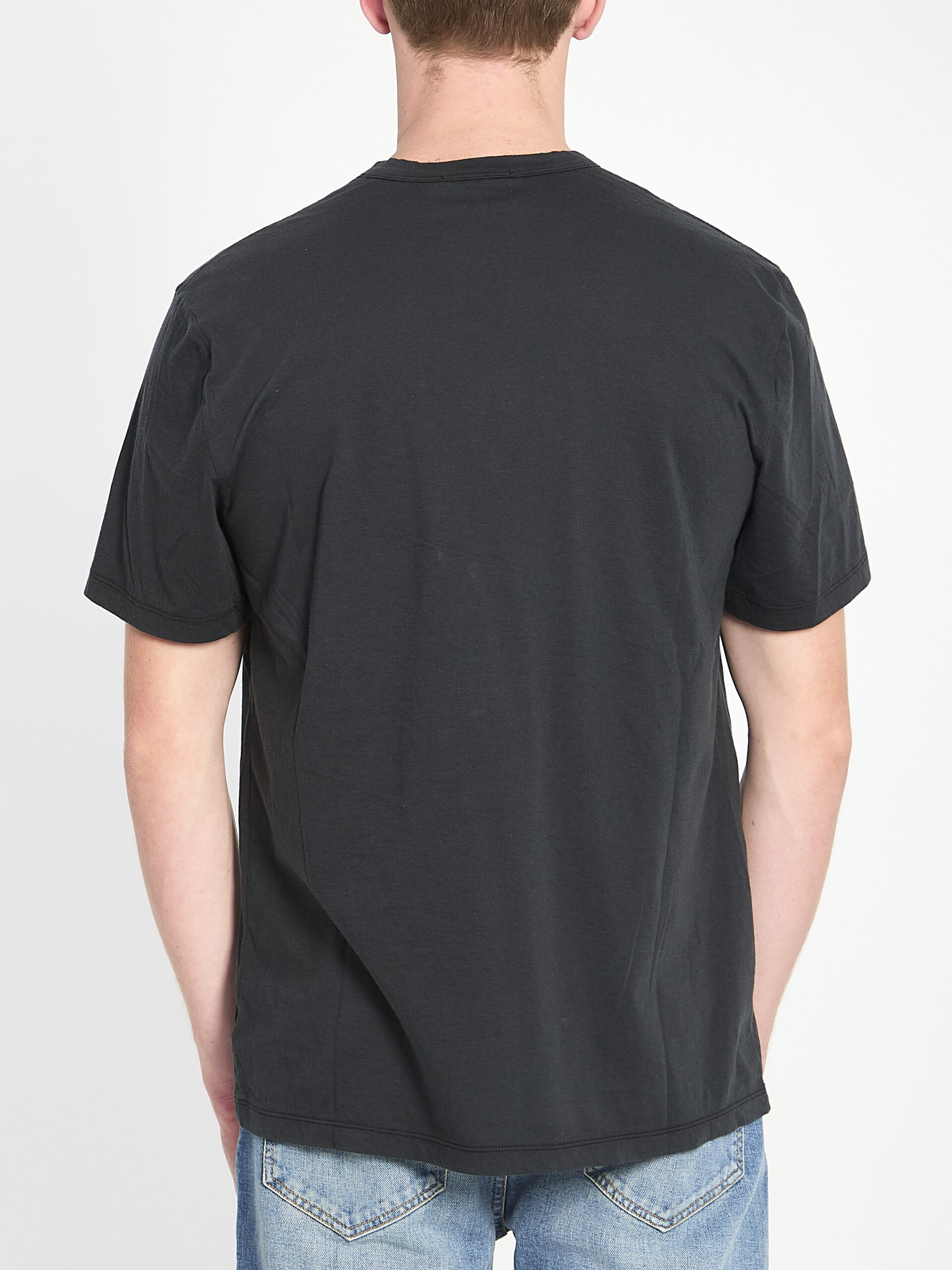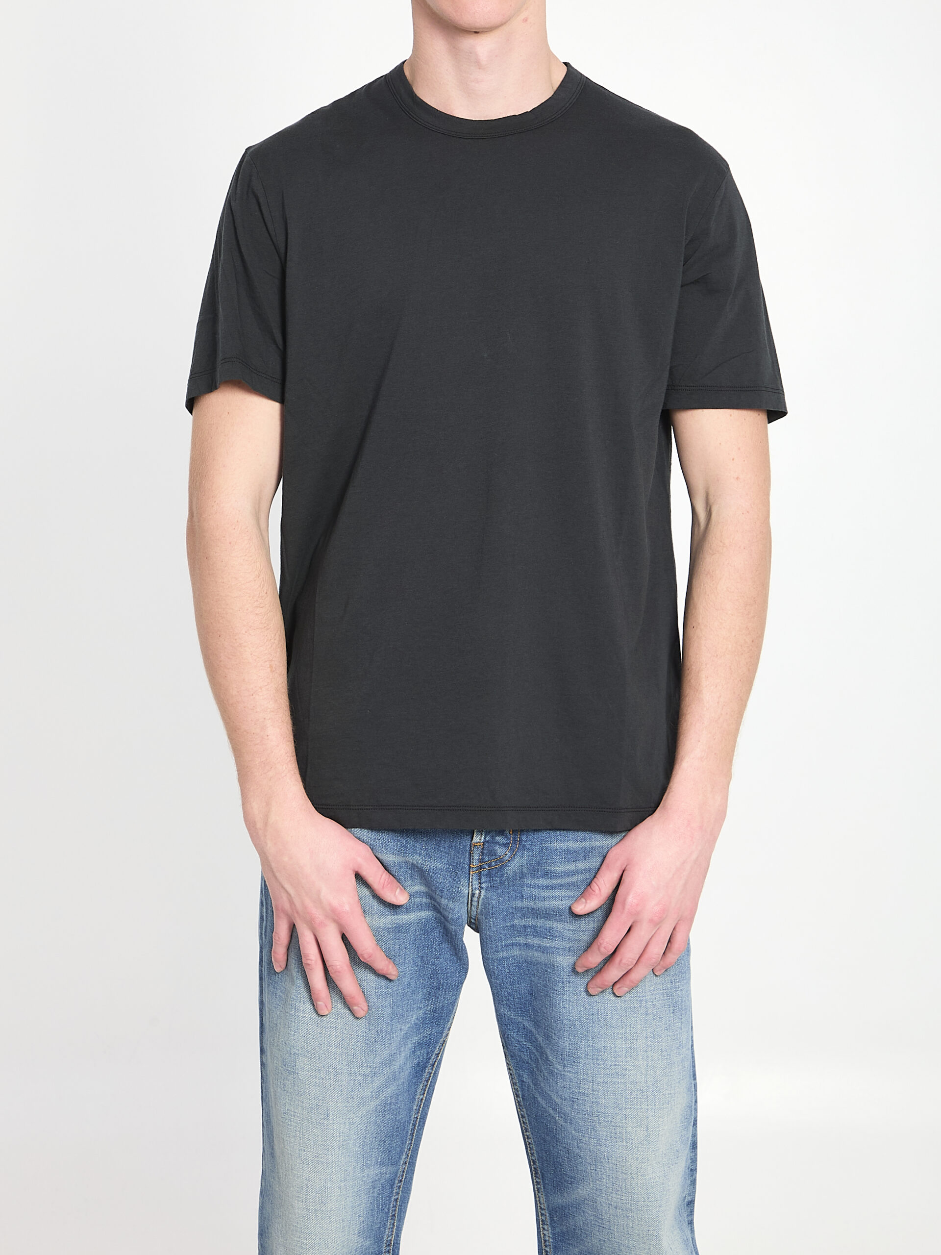 Charcoal grey Japanese cotton t-shirt. Features a ribbed crew neck, short sleeves. Regular fit.