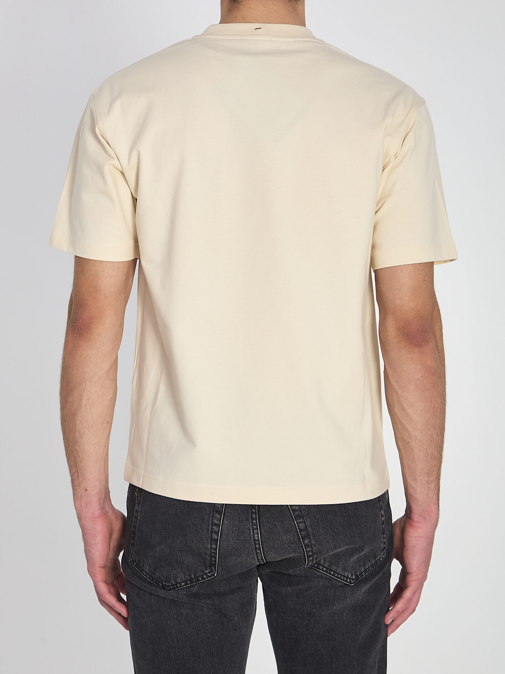 Beige t-shirt in an elasticized cotton jersey blend. Features a ribbed crew neck, short sleeves, a denim pocket with a flap and snap closure on the chest, an iconic logo patch on the chest, and a removable carabiner. Regular fit.