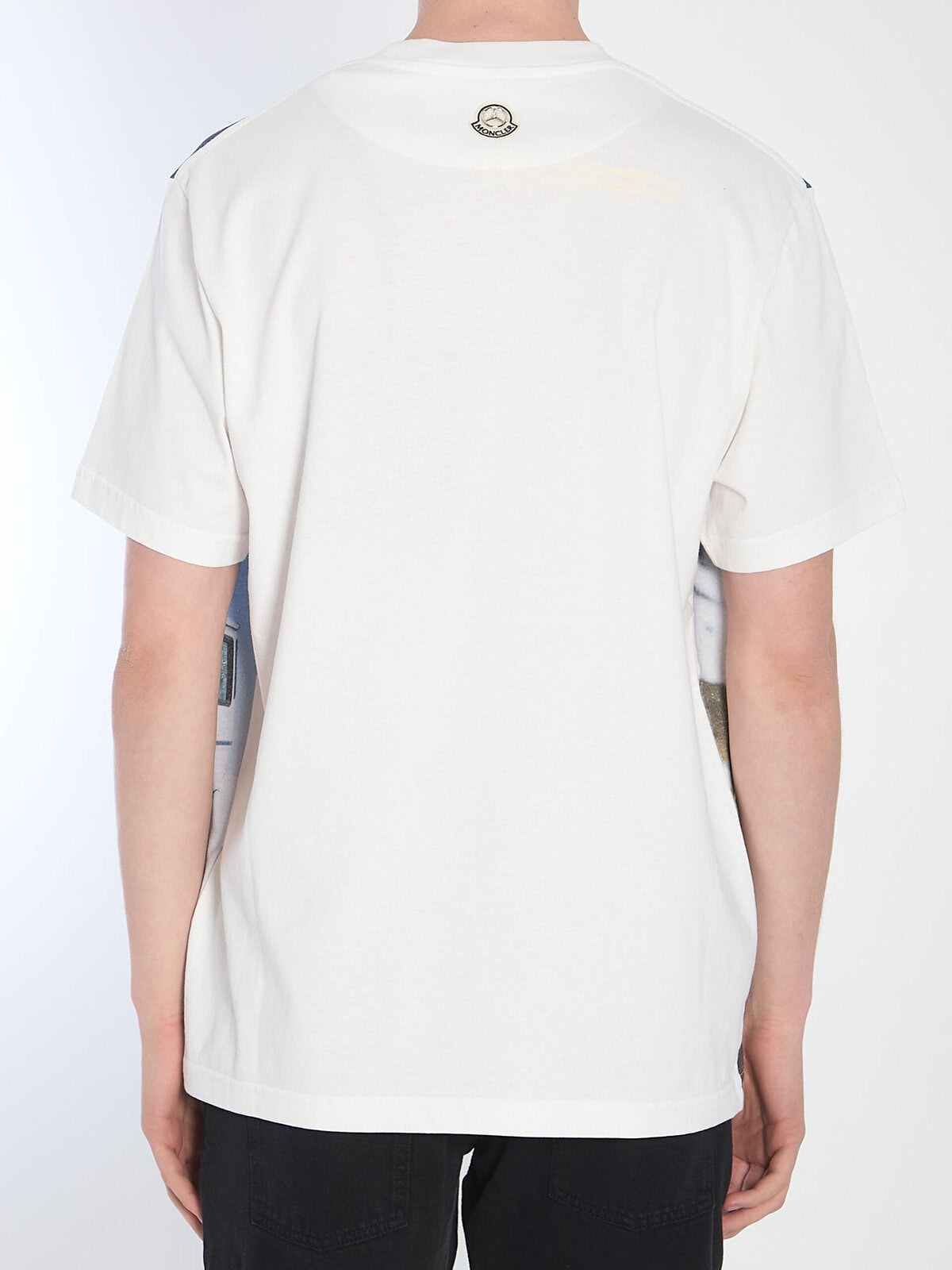 Moncler x Mercedes-Benz by Nigo white cotton jersey short-sleeve crew-neck t-shirt with a logo and car print on the front. It features a Moncler x Mercedes-Benz patch on the back and a ribbed crew neck. Loose fit.