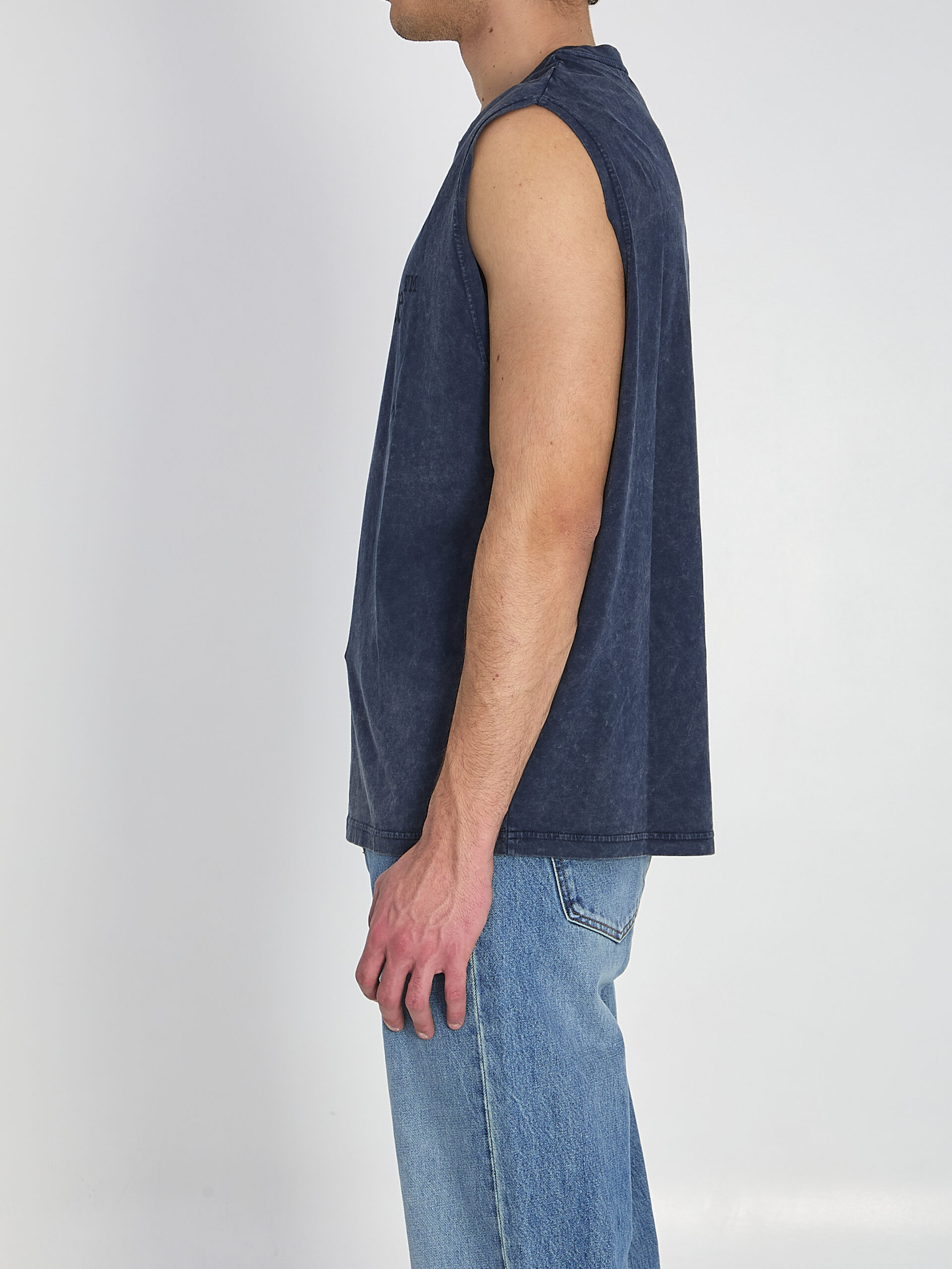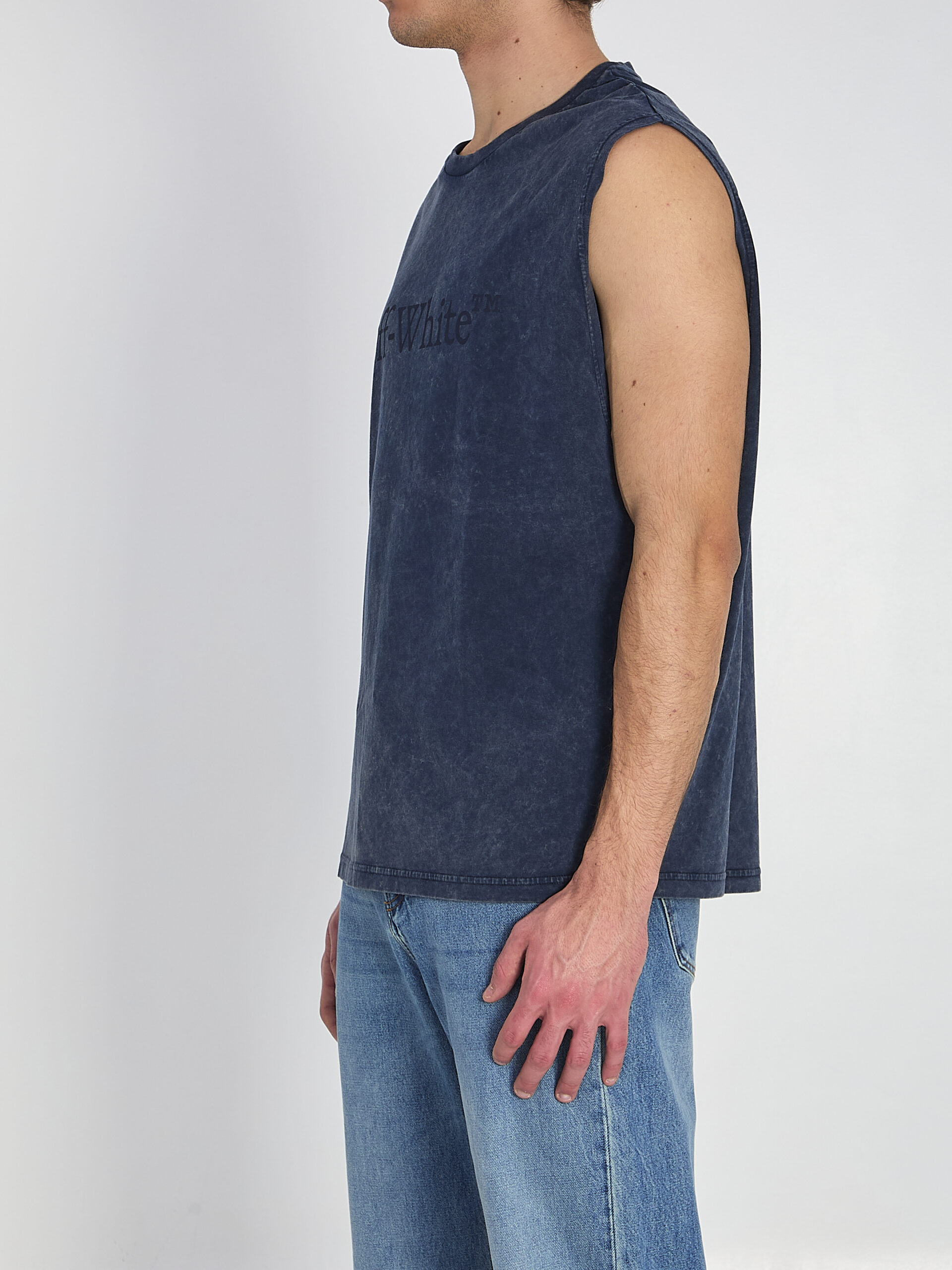 Night blue cotton sleeveless top. Features a ribbed crew neck, a black Off-White print on the front. Washed effect. Oversized fit.