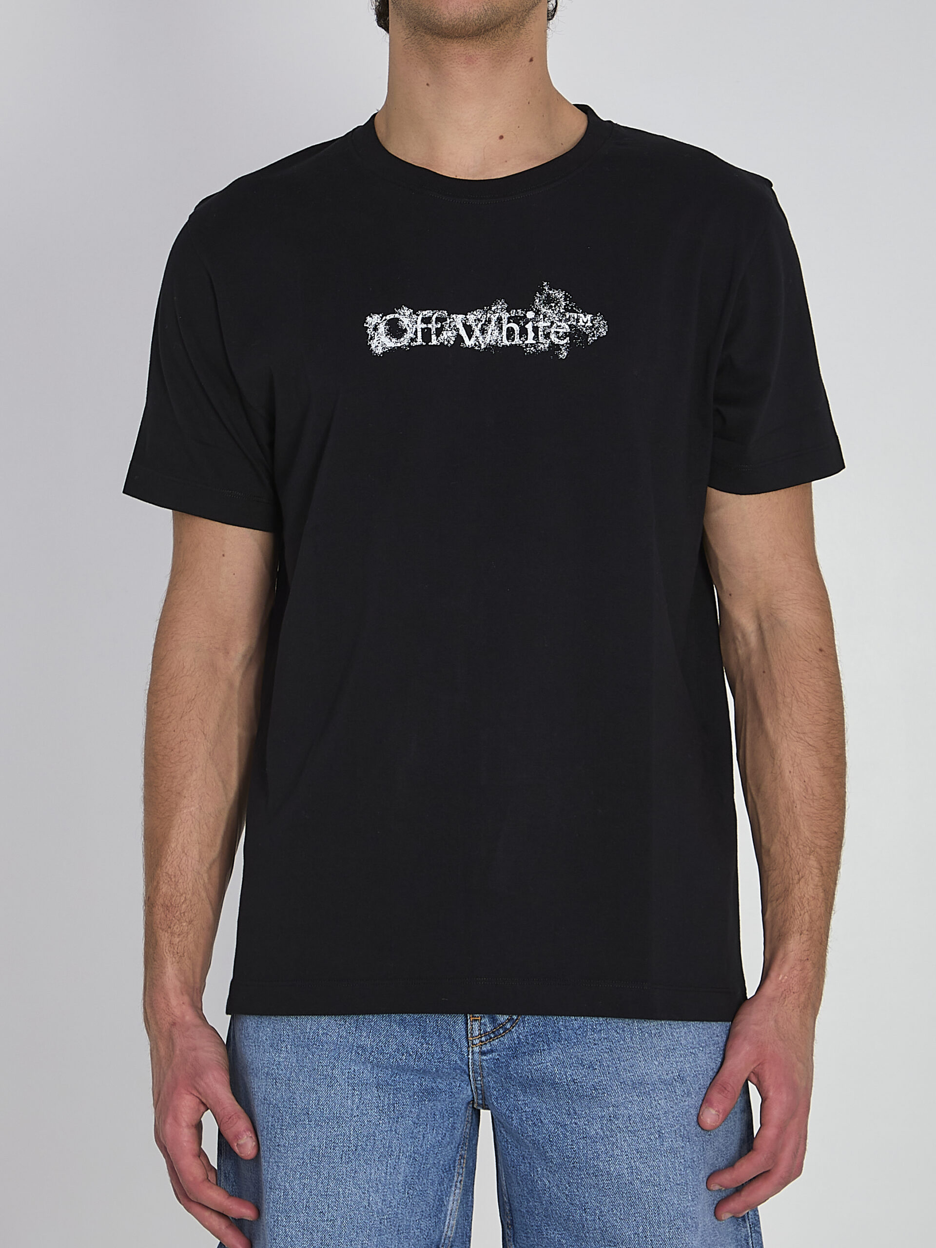 Black cotton jersey t-shirt. Features a ribbed crew neck, short sleeves, an Off-White print on the front, and a white Heraldic Threshold graphic on the back. Comfortable fit.