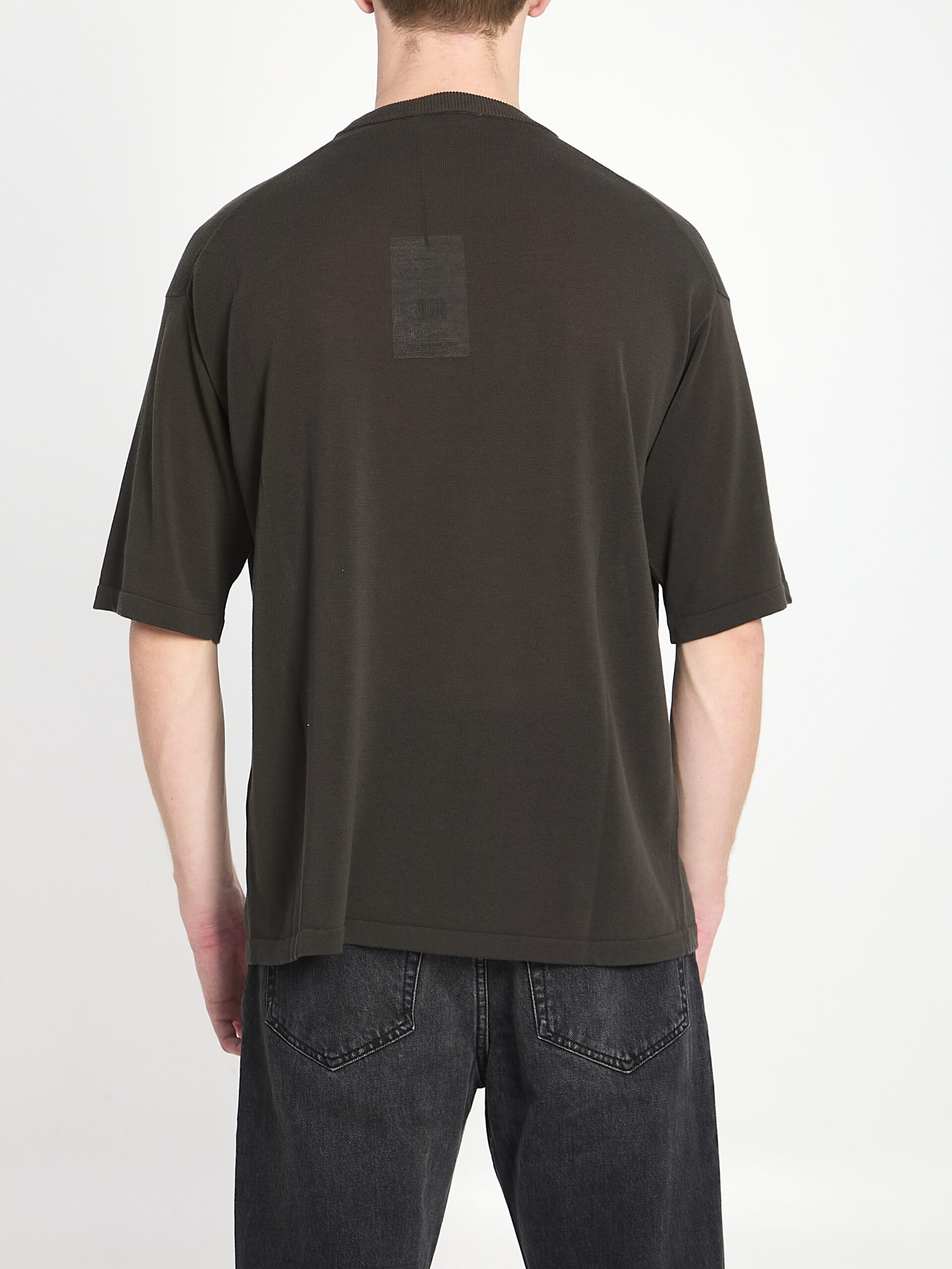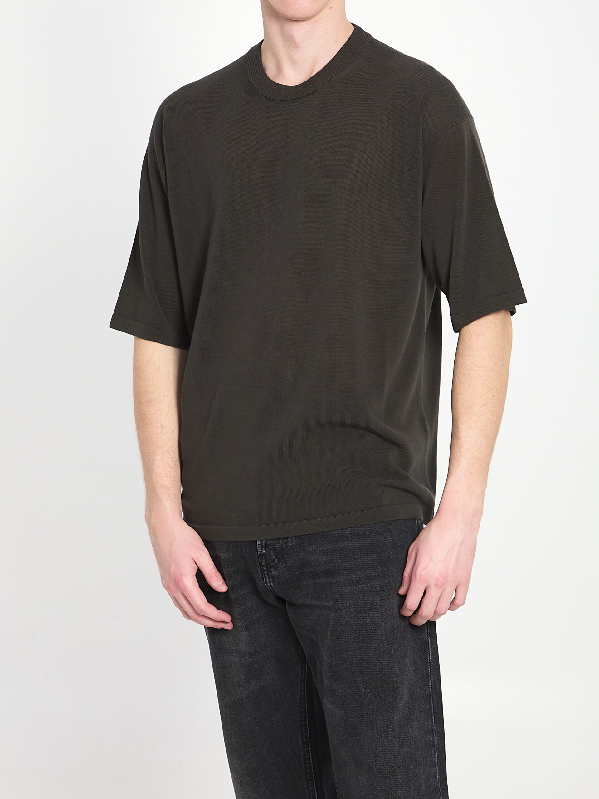Lightweight brown cotton t-shirt. Features a ribbed crew neck and short sleeves. Comfortable fit.