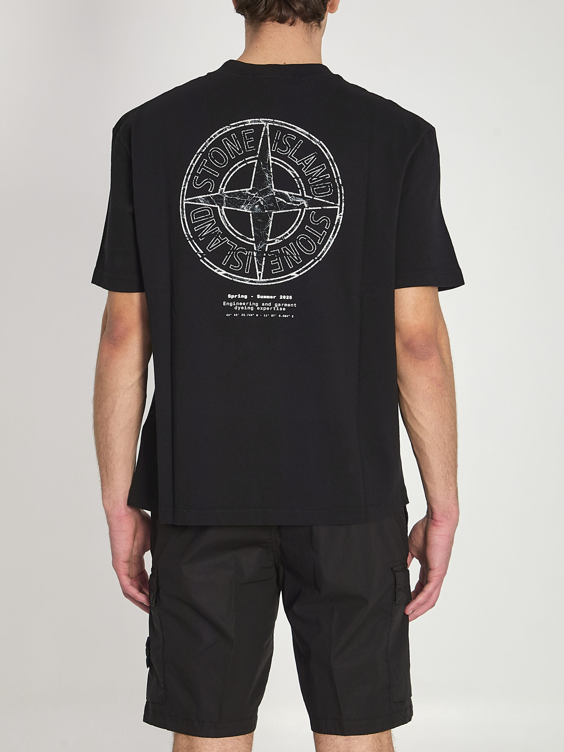Black cotton jersey t-shirt. Features a ribbed crew neck, short sleeves, and a Spring – Summer 2026 print on the front and back. Regular fit.