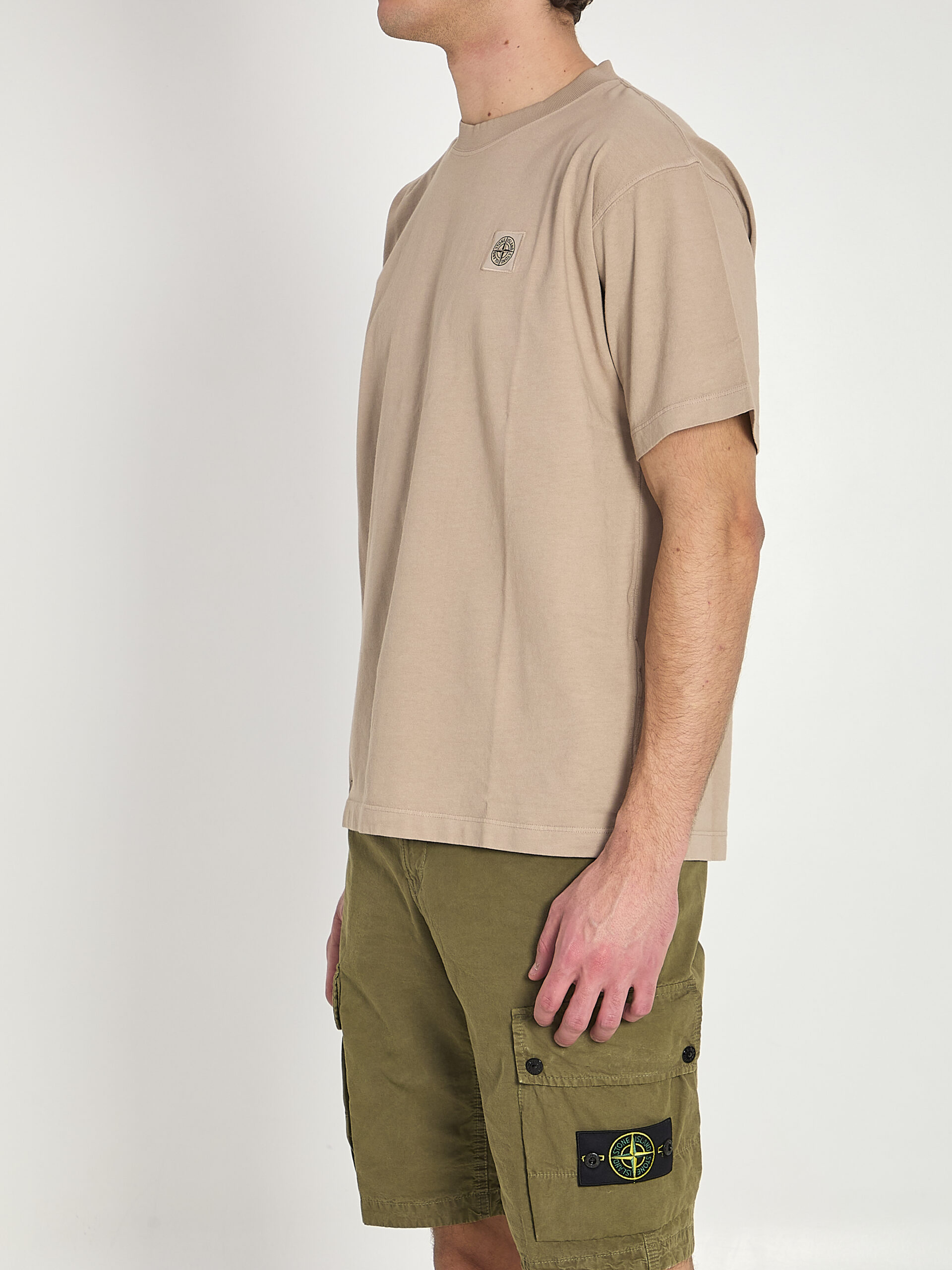 Taupe cotton t-shirt. Features a ribbed crew neck, short sleeves, and an embroidered logo on the chest. Oversized fit.
