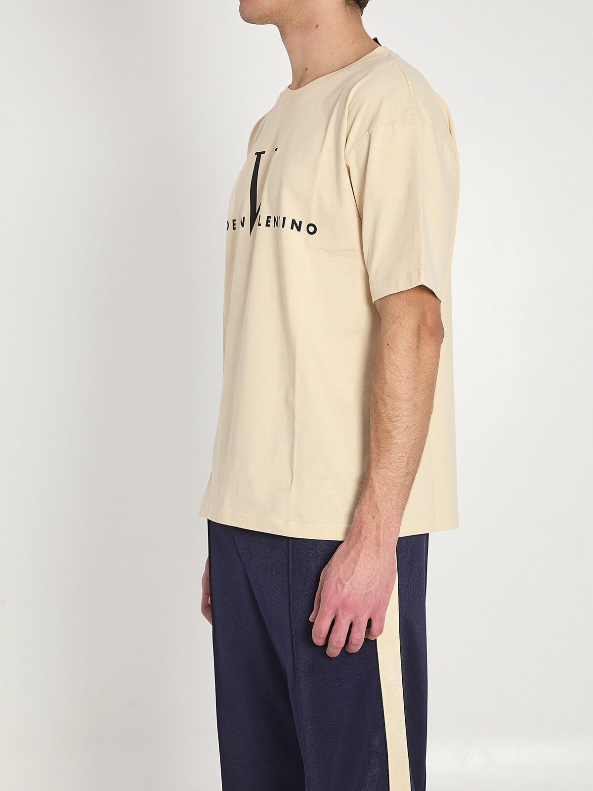 Butter white cotton jersey t-shirt. It features a ribbed crew neck, short sleeves, and a black Made in Valentino print on the front. Regular fit.