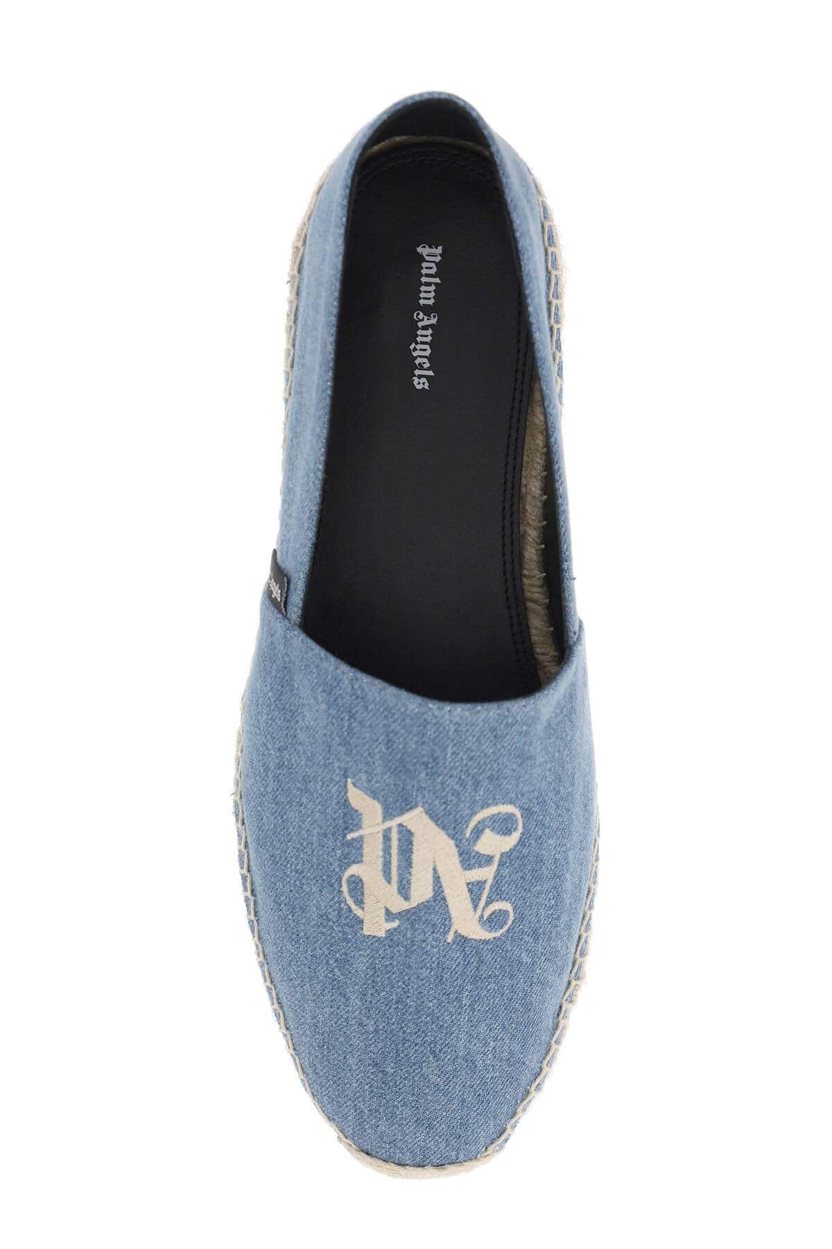 Palm Angels espadrilles made of pure cotton denim and characterized by contrasting embroidered logo. Leather lining and insole, woven rope base, rubber sole.