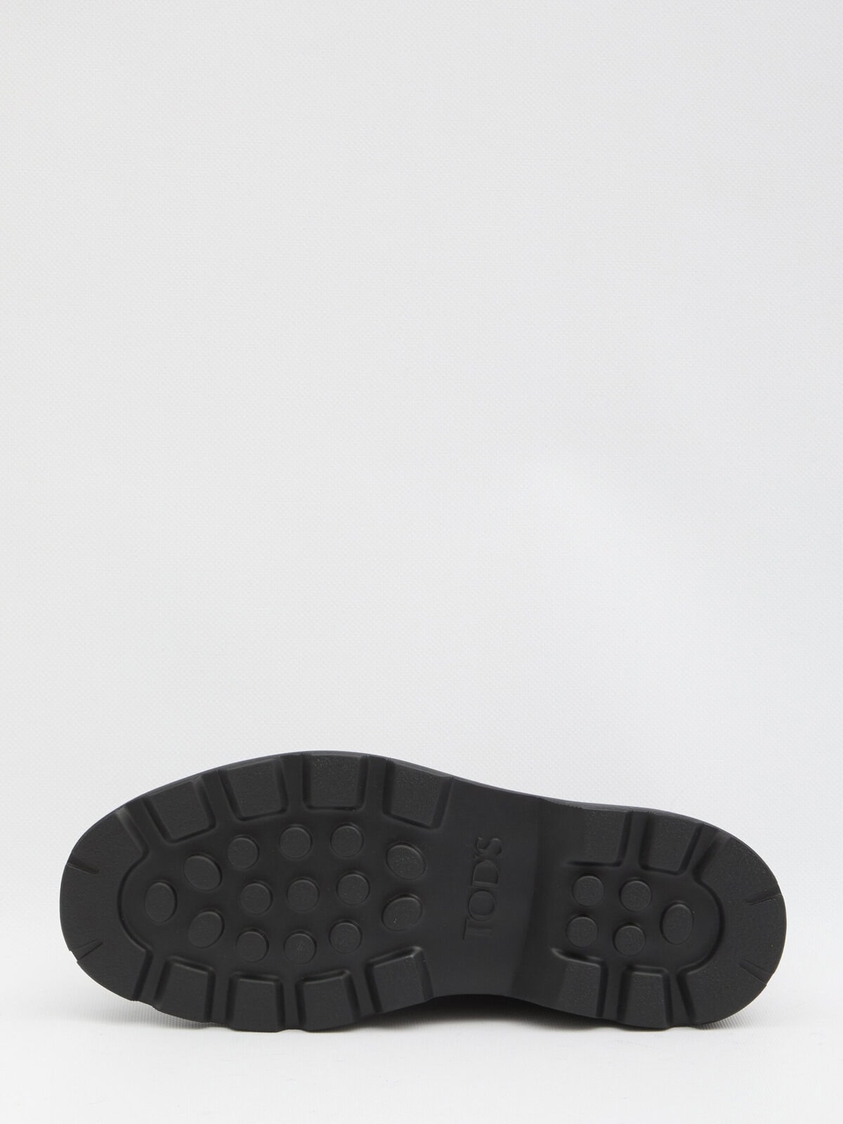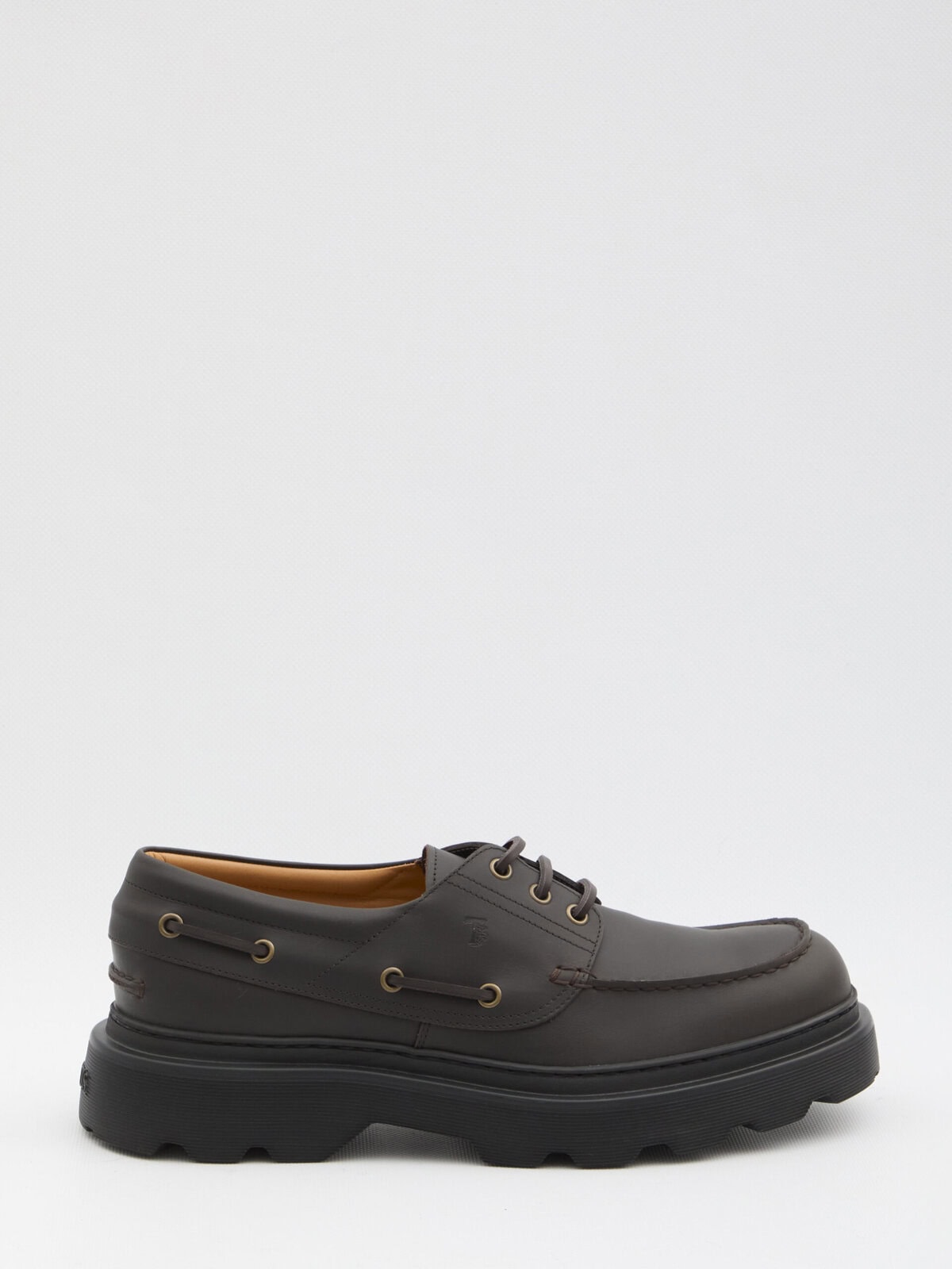 Dark brown leather boat shoe. Featuring a round toe, leather lace closure, embossed logo detail, and tank tread-style rubber sole. Dust bag included. Any imperfections in the leather are not to be considered manufacturing defects, but rather a characteristic of the material.