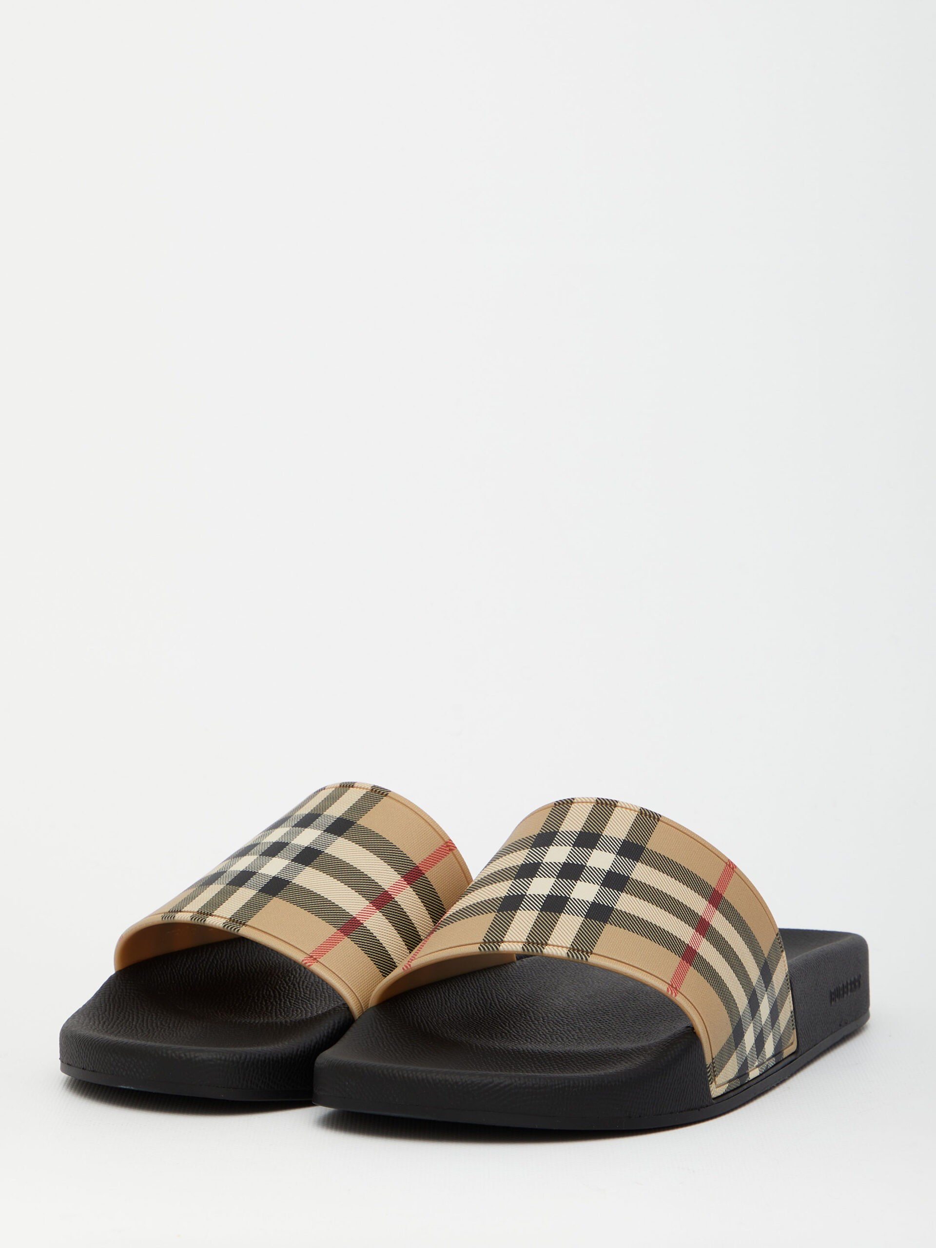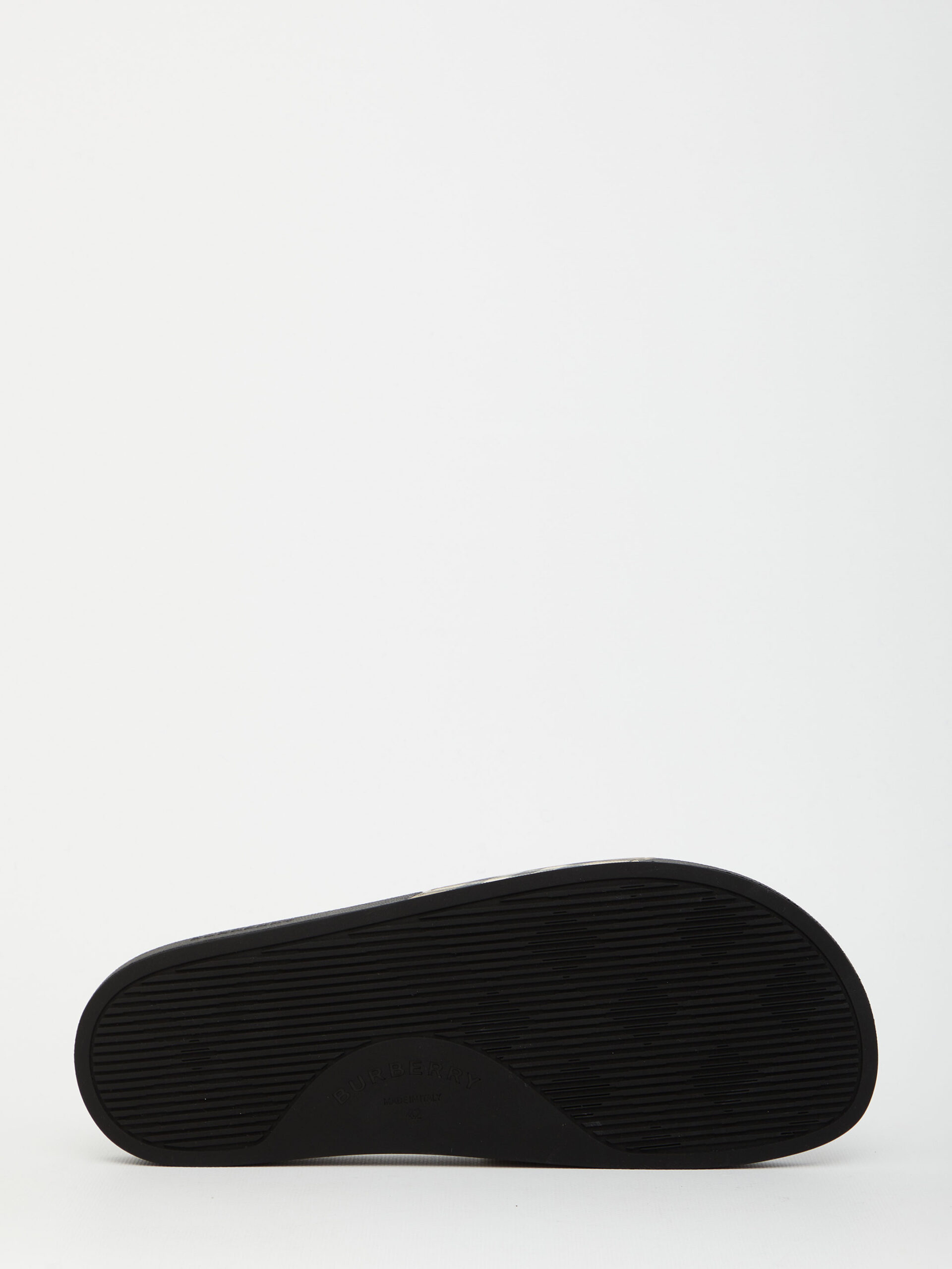 Black rubber slides with Vintage Check motif upper band. They feature contoured insole with embossed Burberry logo, embossed logo on the side and slip-on design.