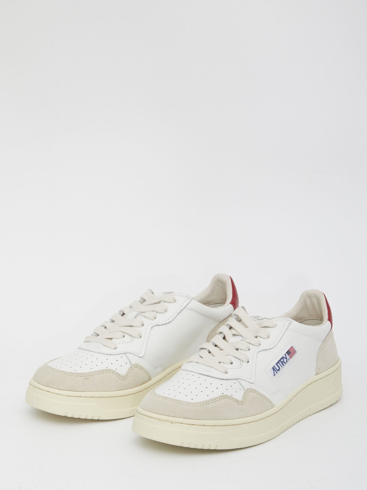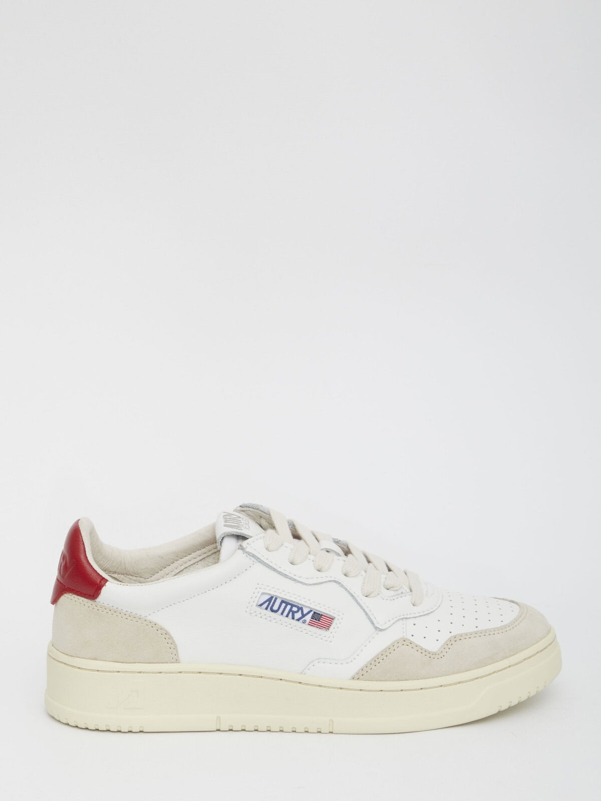 Low-top Medalist sneakers in white leather with suede inserts, red heel and rubber sole. They feature lace-up closure, perforated toe, side detail with Autry blue logo, logo on tongue and embossed logo on the back.