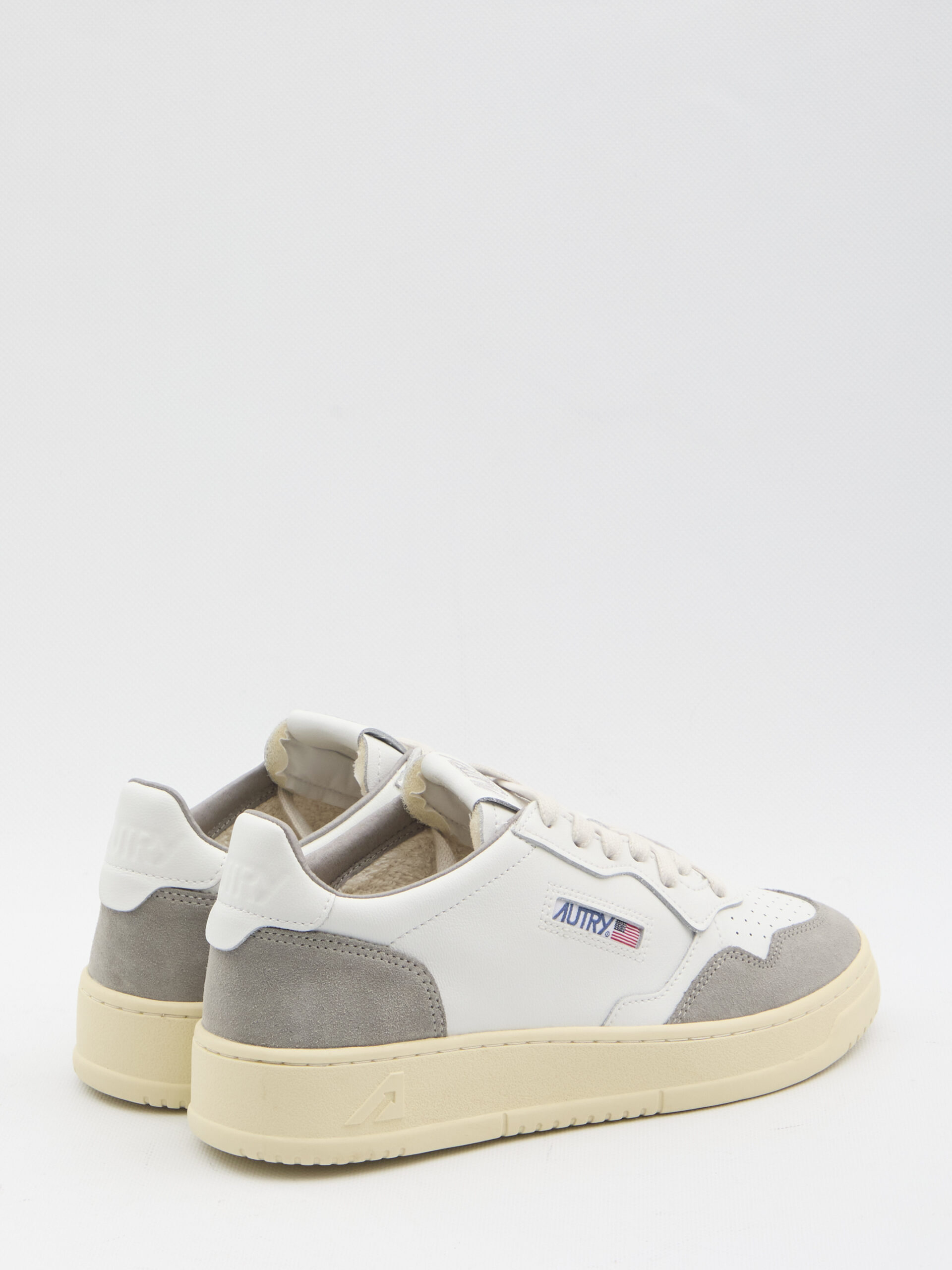 Low Medalist sneakers in white leather with grey suede inserts and a white heel tab. Featuring a lace-up closure, perforated toe, blue Autry logo detail on the side, and branded tongue and back. Dust bag included. Any irregularities in the leather are not to be considered manufacturing defects but characteristics of the material.