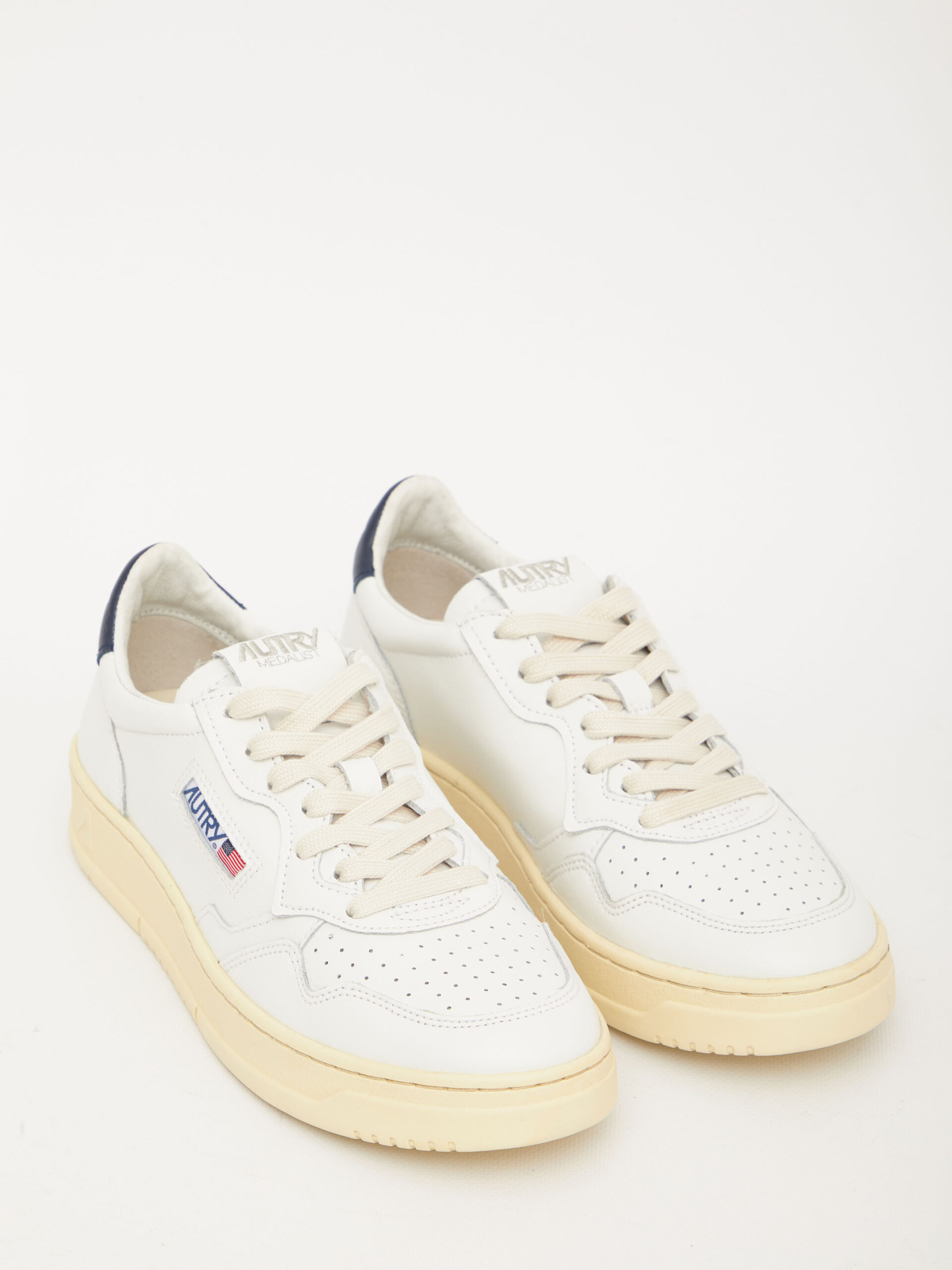 Low-top Medalist sneakers in white leather with blue heel and rubber sole. They feature lace-up closure, perforated toe, side detail with Autry blue logo, logo on tongue and embossed logo on the back.