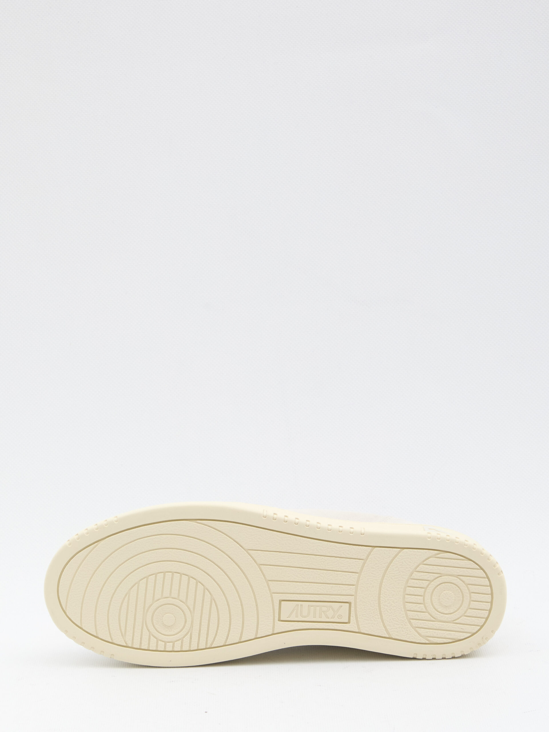Suede marble white sneakers with glossy leather heel tab. They feature a round toe with micro perforations, lace-up closure, Autry Medalist tongue, logo on the side and sole, embossed signature on the back, and rubber sole. Dustbag included. Any imperfections in the leather should not be considered manufacturing defects but a characteristic of the material.