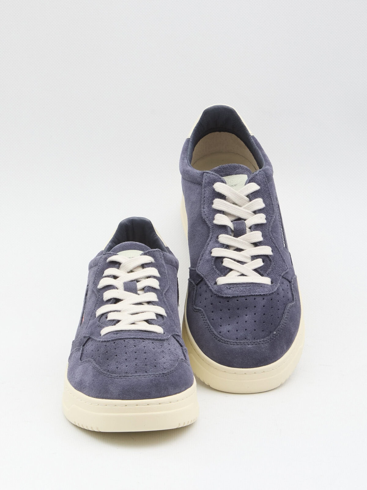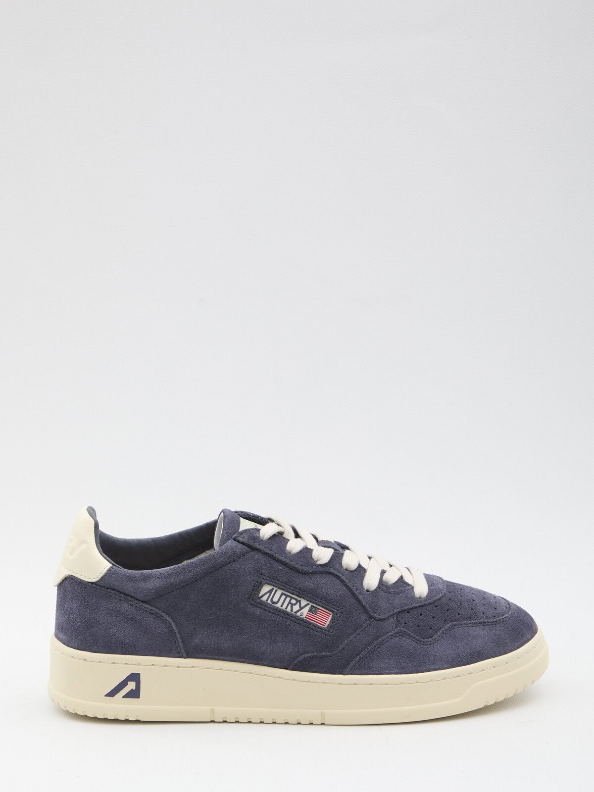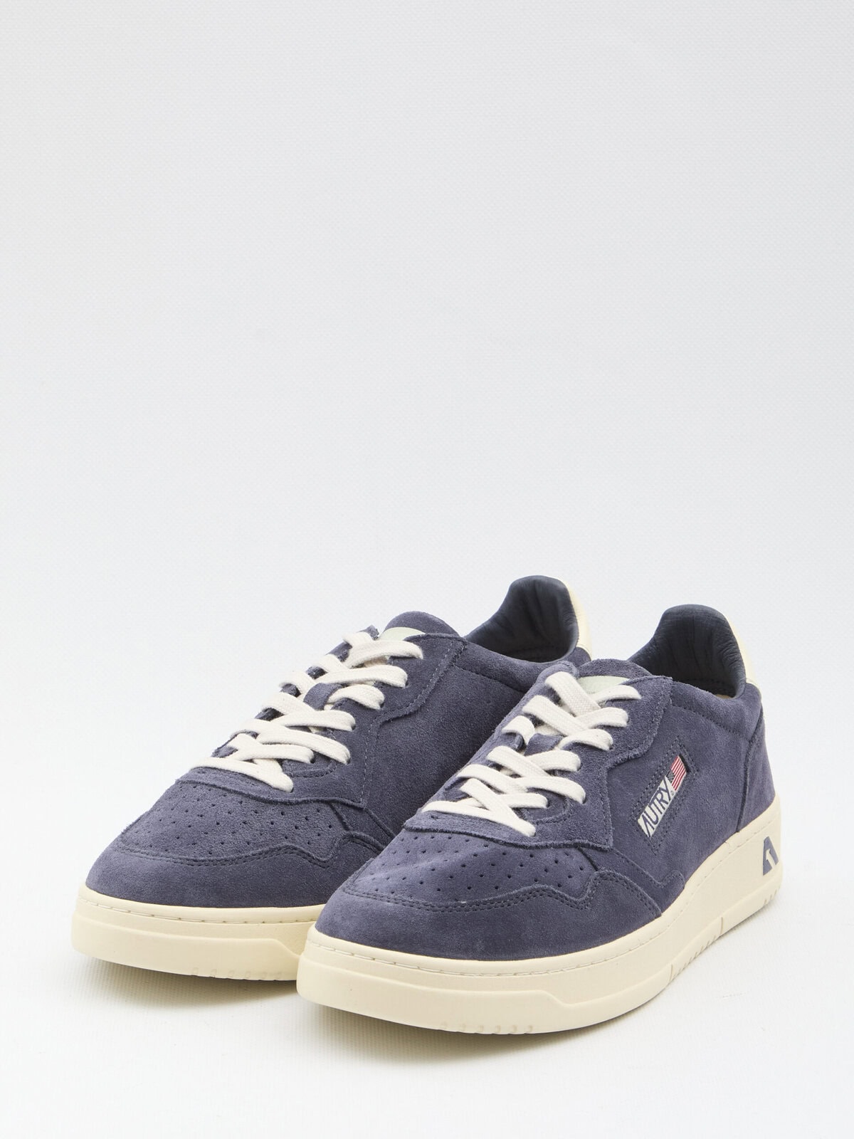 Blue suede sneakers with contrasting glossy leather heel tab. They feature a round toe with micro perforations, lace-up closure, Autry Medalist tongue, logo on the side and sole, embossed signature on the back, and rubber sole. Dustbag included. Any imperfections in the leather should not be considered manufacturing defects but a characteristic of the material.