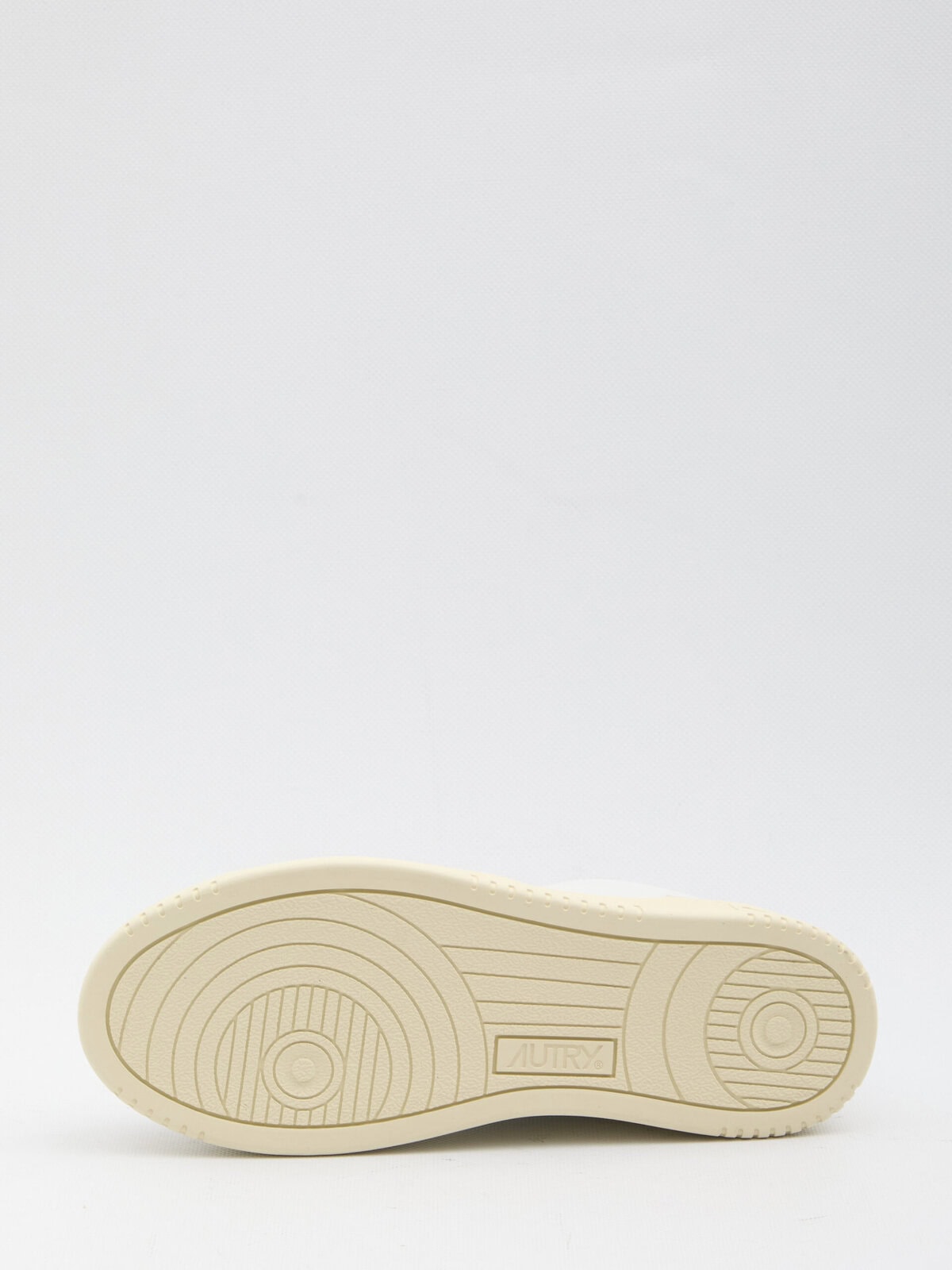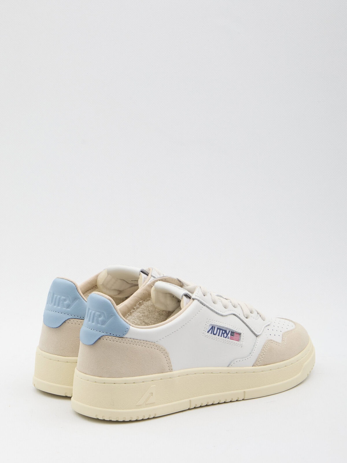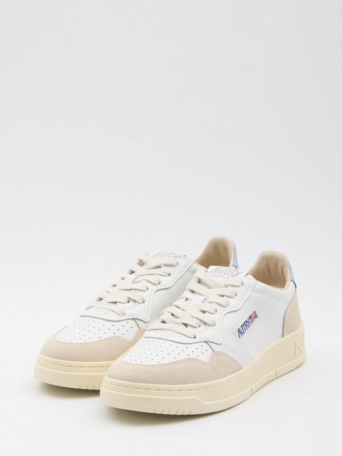 Leather sneakers with beige suede inserts and a Silver Blue leather heel tab. They feature a perforated toe, flat lace-up closure, a label with embroidered logo sewn onto the tongue, padded collar, beige suede reinforcements, and a logo on the side. Dustbag included. Any imperfections in the leather should not be considered manufacturing defects, but rather a characteristic of the material.