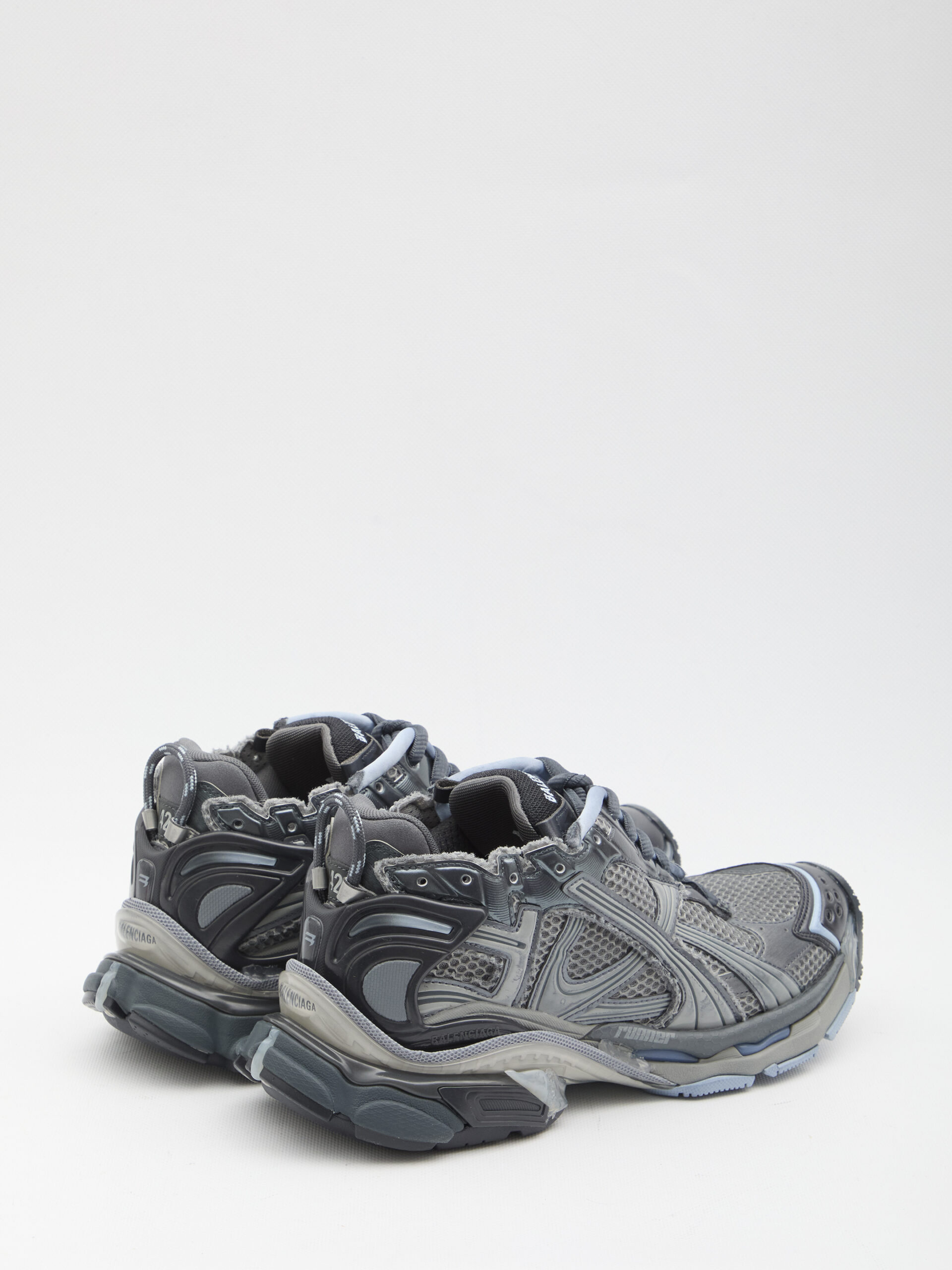 Sneakers in polyurethane and polyester in grey, navy, and light blue colors. They feature the size printed on the toe and embossed on the back, a printed Runner logo on the outer side, an embroidered Balenciaga logo on the tongue and heel, a heel pull tab, lace-up closure, foam insole, and rubber sole. Dustbag included.