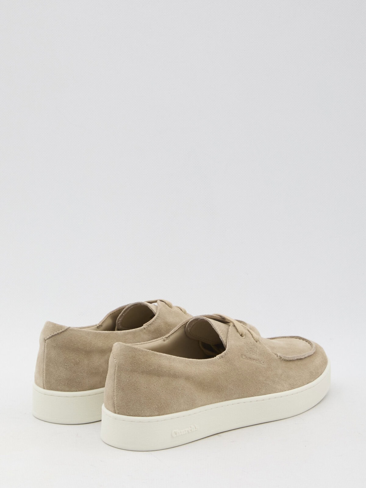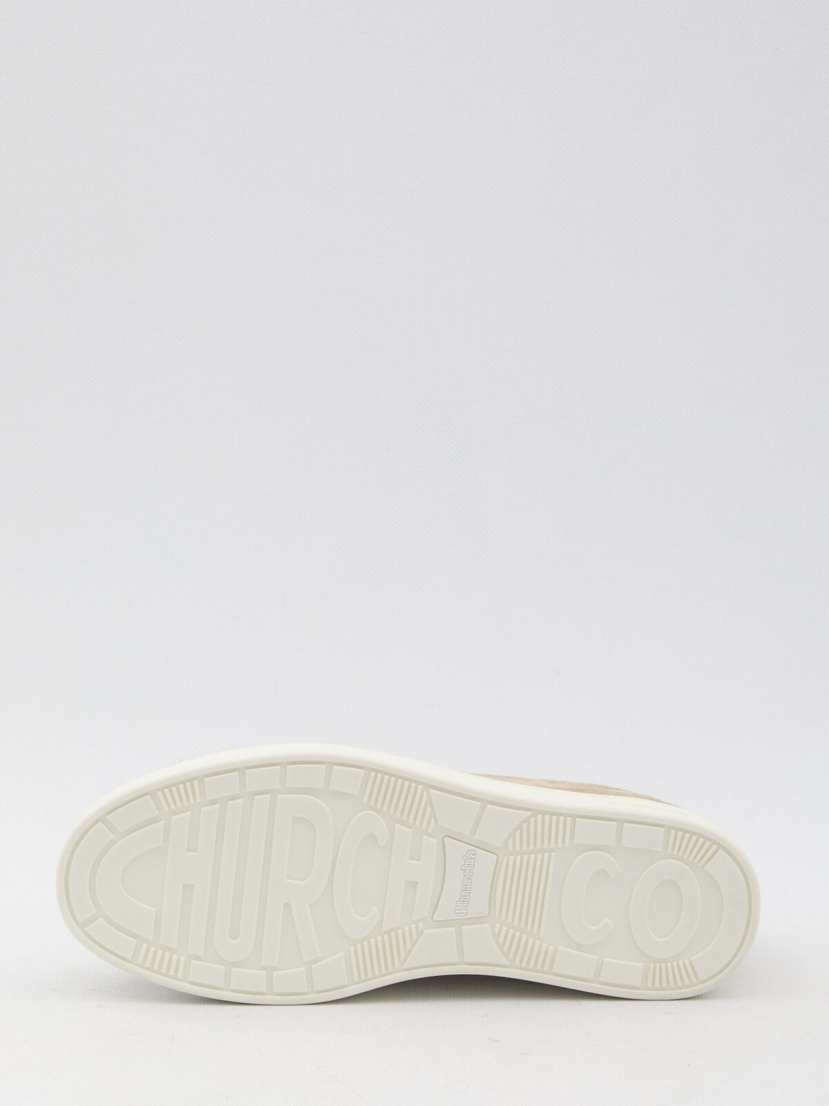 Longsight 2 lace-up shoes in desert-colored suede with stitching on the vamp. They feature an embossed Church’s logo on the side and a white rubber sole with Church’s & Co logo. Dust bag included. Any leather imperfections are not to be considered manufacturing defects, but a peculiarity of the material.