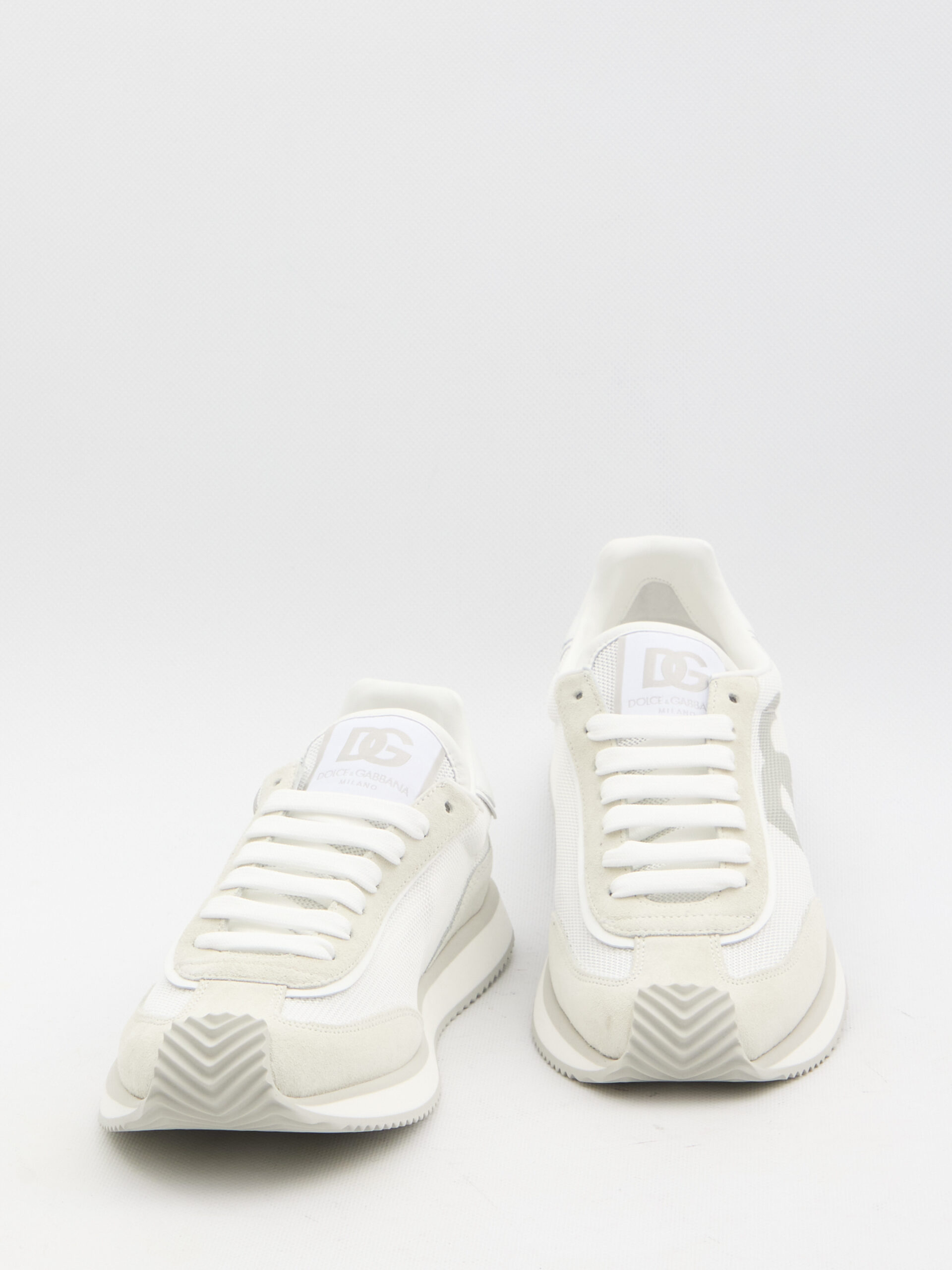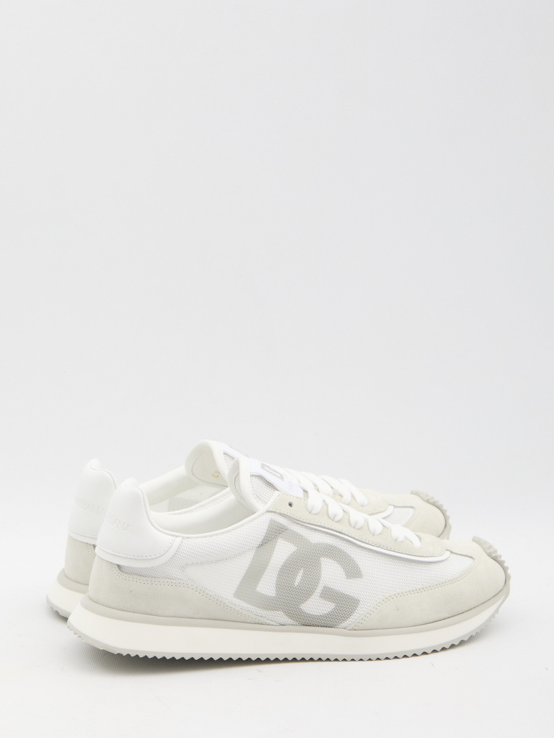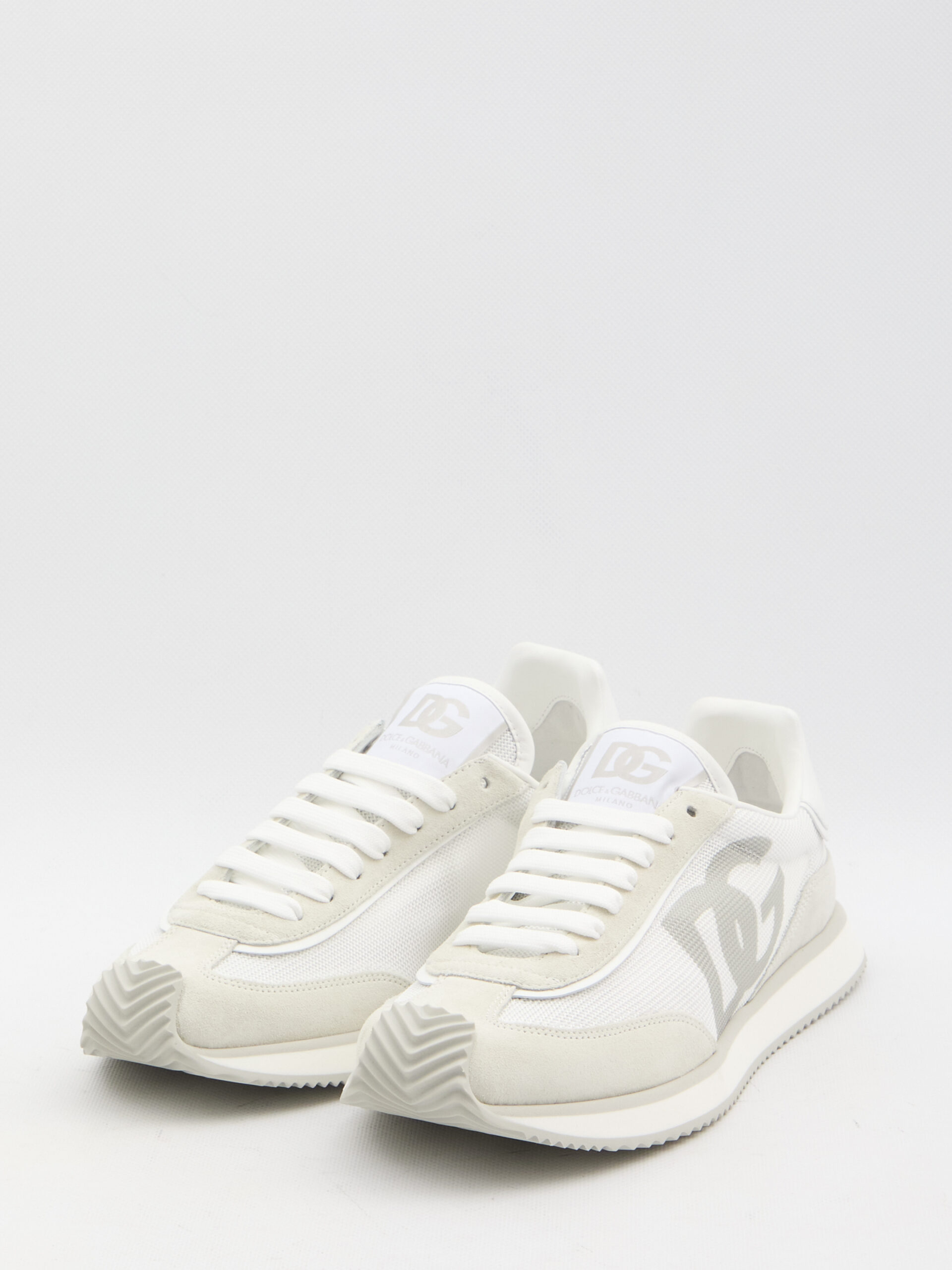 DG Cushion sneakers in white and grey suede and mesh. They feature a lace-up closure, DG logo on the tongue and side, embossed Dolce & Gabbana logo on the back, and a rubber sole. Dust bag included. Any leather imperfections are not to be considered manufacturing defects, but a peculiarity of the material.