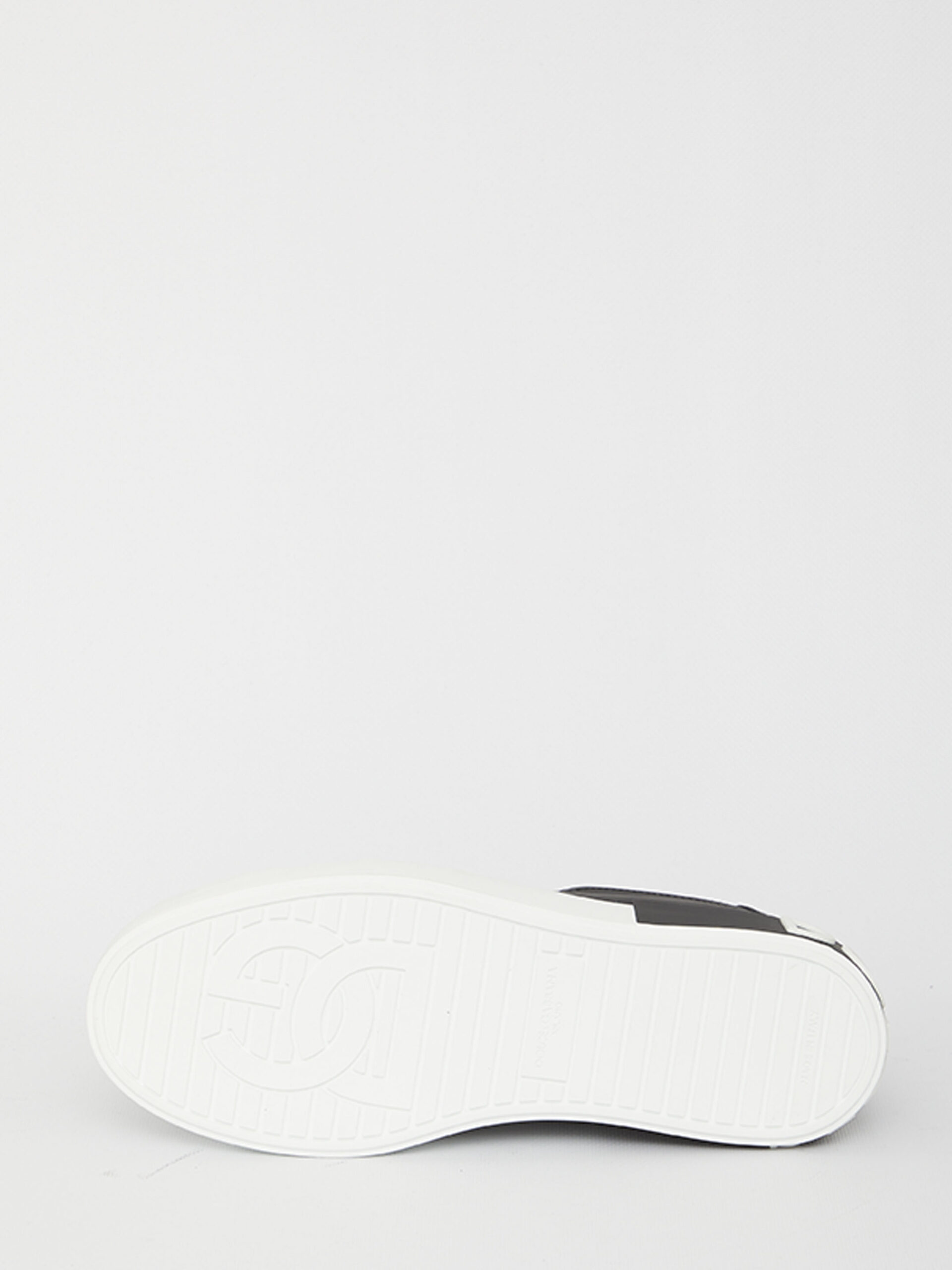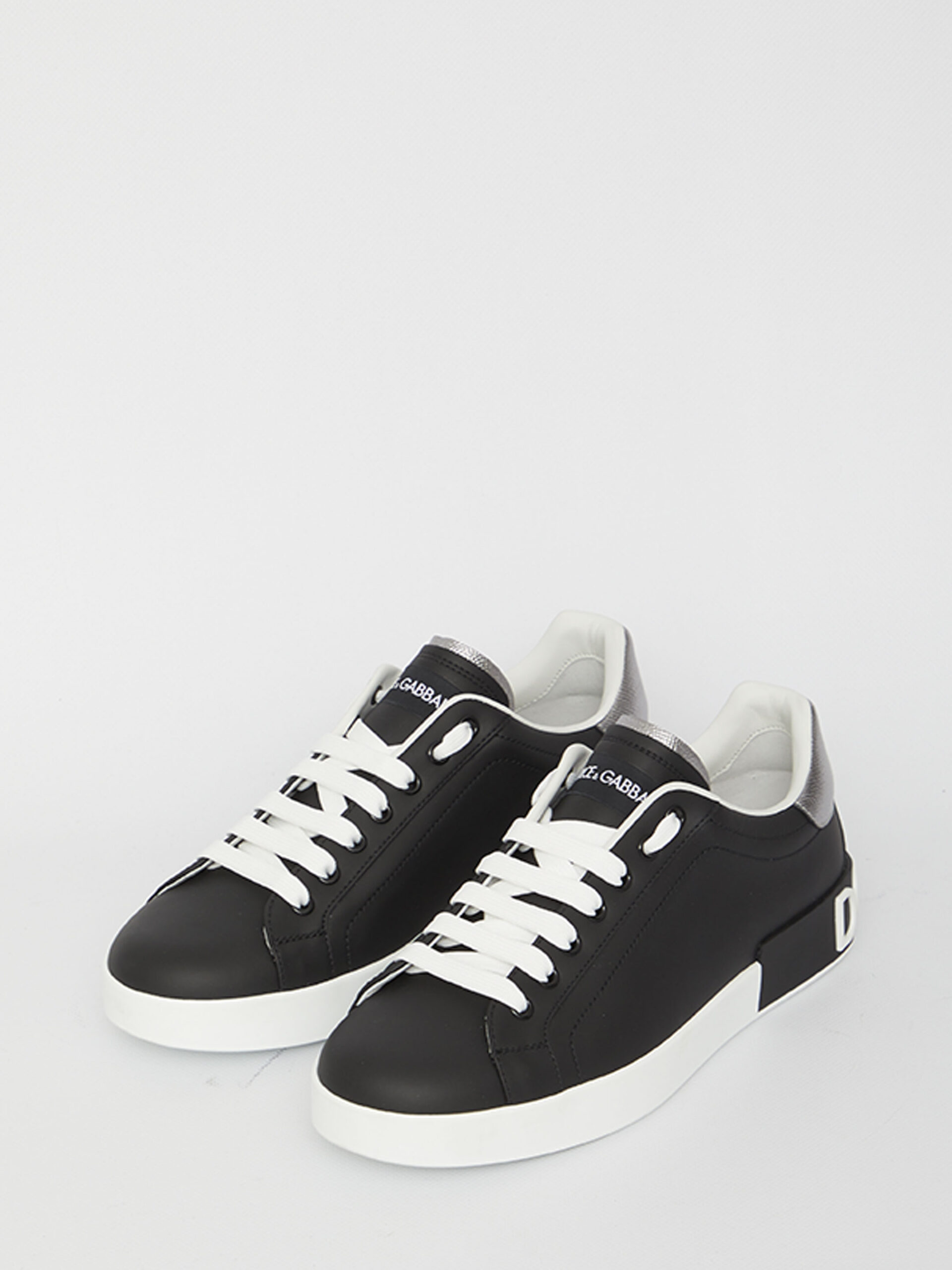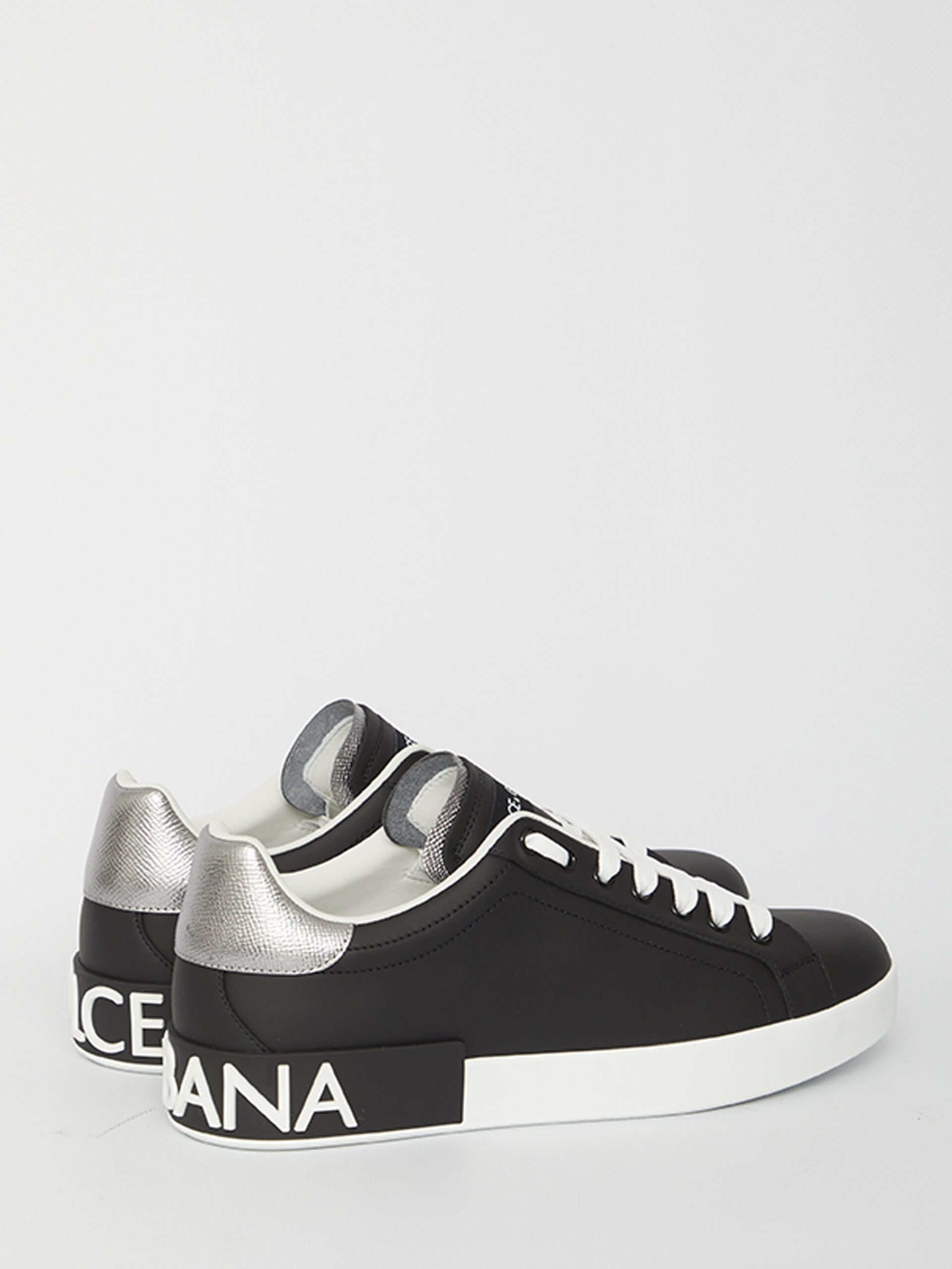 Portofino sneakers in black calfskin with silver-tone details and white rubber sole. Lace-up closure and embossed Dolce & Gabbana logo at the back. Any leather imperfections are not to be considered manufacturing defects, but a peculiarity of the material.