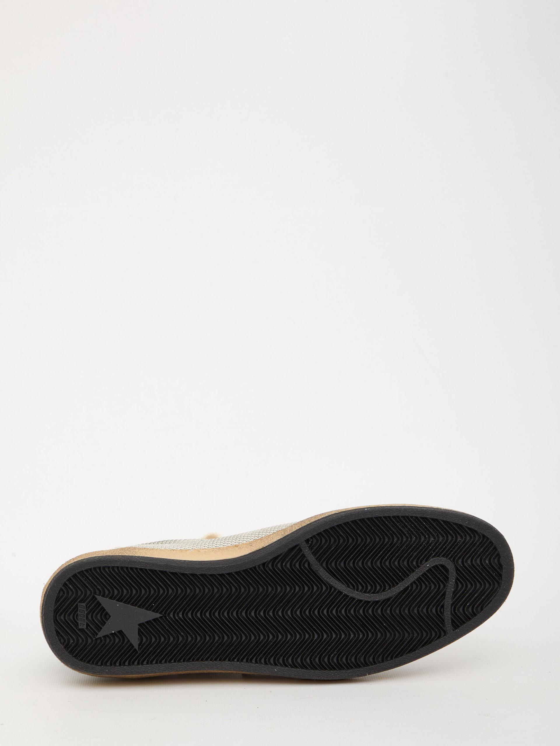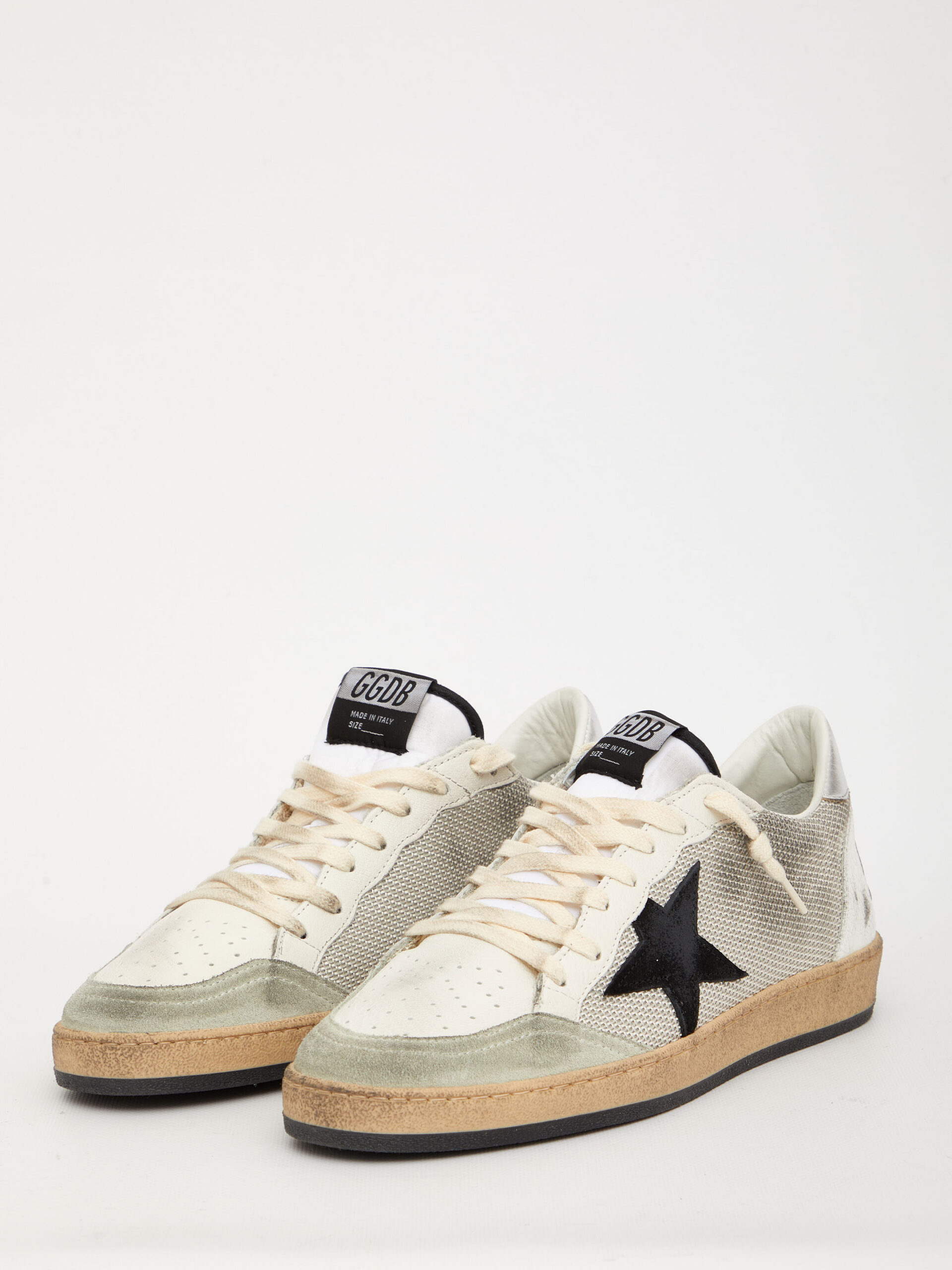 Ball Star sneakers in white leather with laminated grey inserts and suede details. They feature a lace-up closure, metallic heel tab, embossed Sneakers logo on the back, and a rubber sole. Vintage effect. Dust bag included. Any imperfections in the leather should not be considered manufacturing defects, but a characteristic of the material.