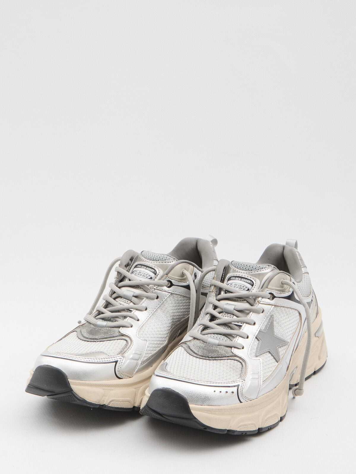 Mesh and nappa sneakers in grey, silver, and black. Featuring a round toe, lace-up closure, Lightstar logo on the tongue, grey star detail on the side, heel pull tab, and rubber sole. Worn effect. Dustbag included. Any imperfections in the leather should not be considered manufacturing defects, but rather a characteristic of the material.