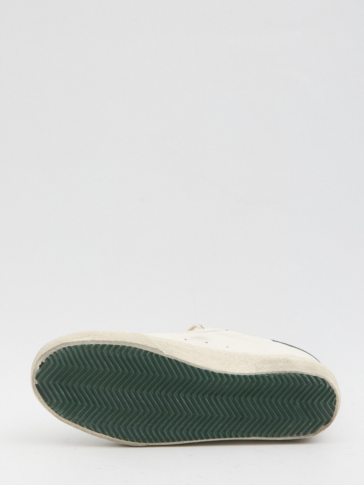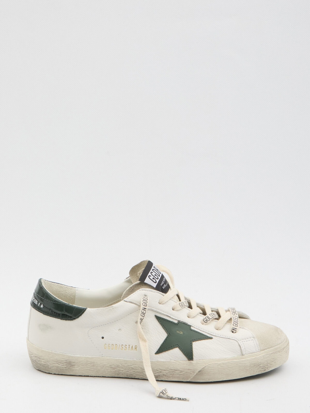 White nappa leather sneakers. Featuring a round toe, suede toe and tongue, GGDB label on the tongue, custom lace-up closure, green star detail on the side, green crocodile leather heel tab, signature on the side and back, and rubber sole. Worn effect. Any imperfections in the leather should not be considered manufacturing defects, but rather a characteristic of the material.