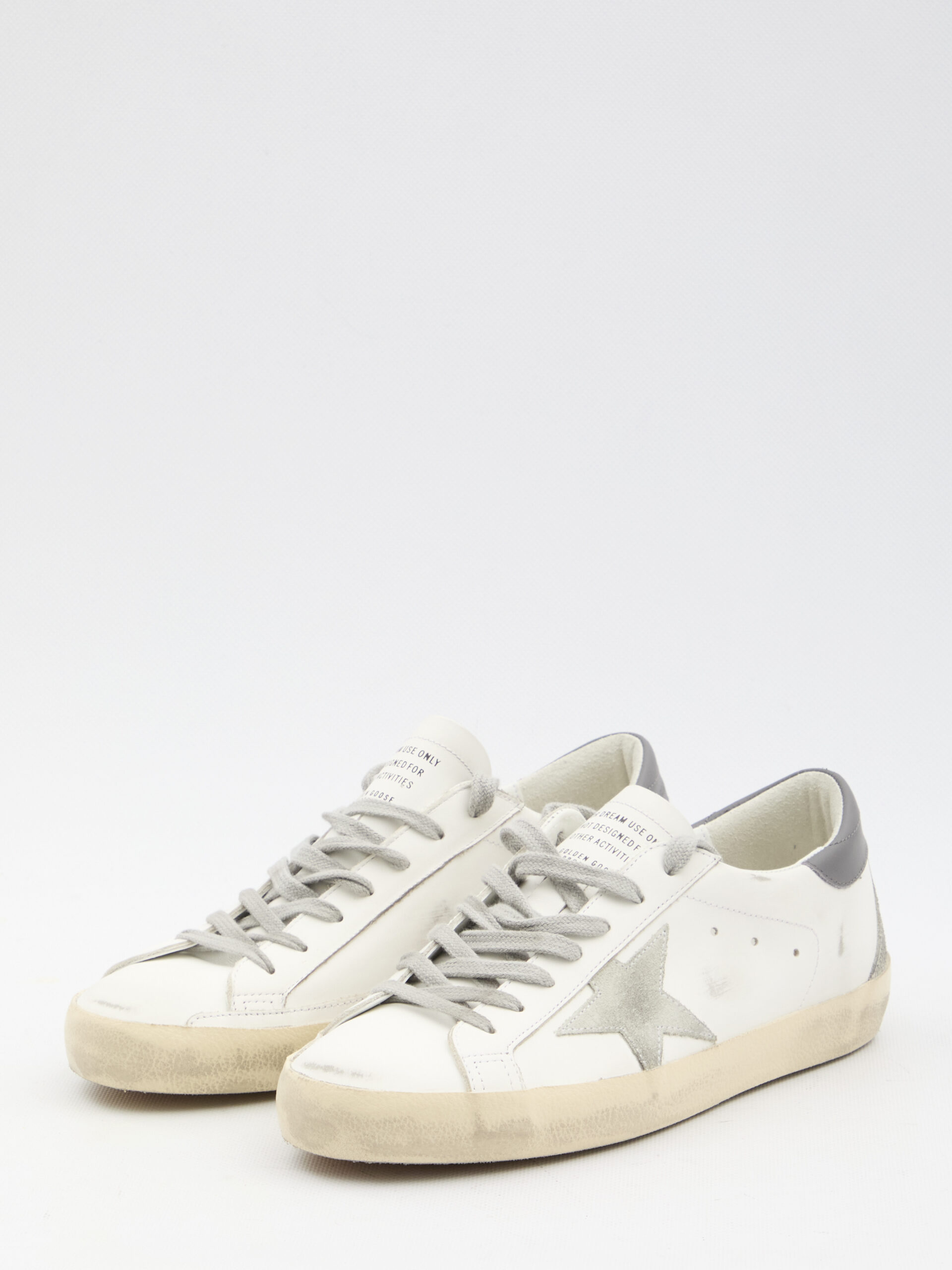 Super-Star sneakers in white leather with vintage effect, side suede star, grey leather heel and rear suede insert. They feature round toe, lace-up closure, logoed tongue, logo on the side and on the back and rubber sole. Worn-out effect. Dust bag included. Any leather imperfections are not to be considered manufacturing defects, but a peculiarity of the material.
