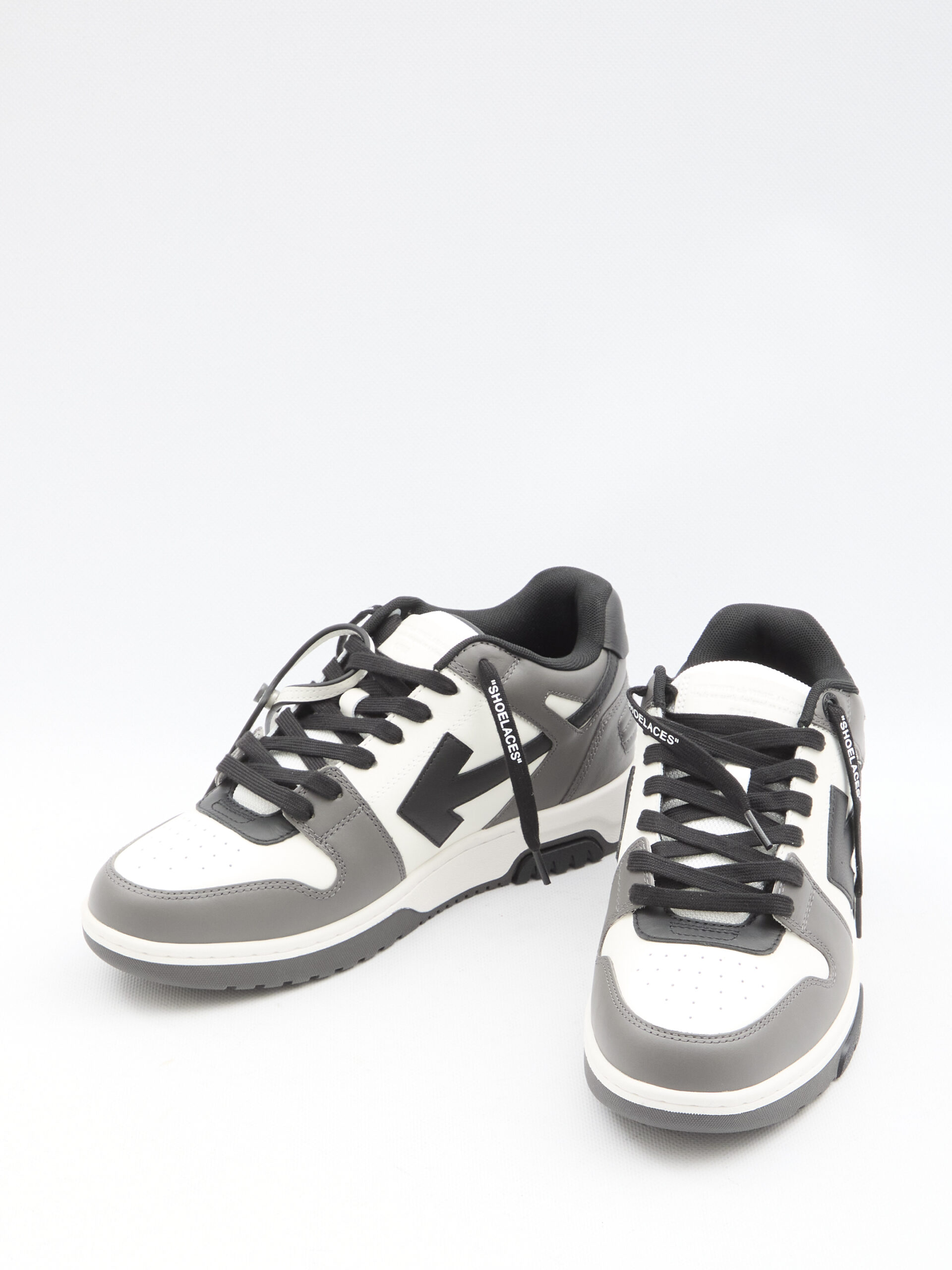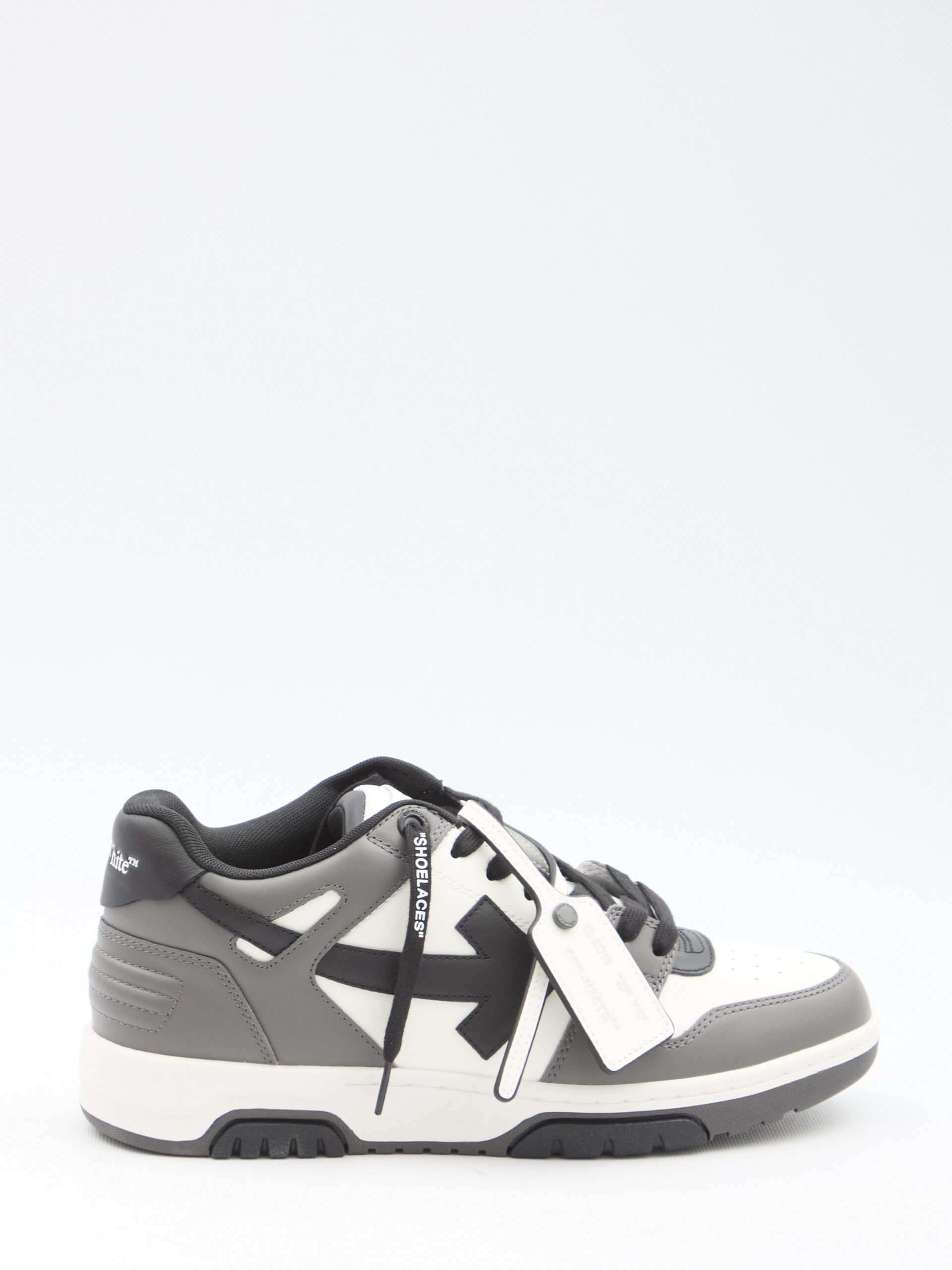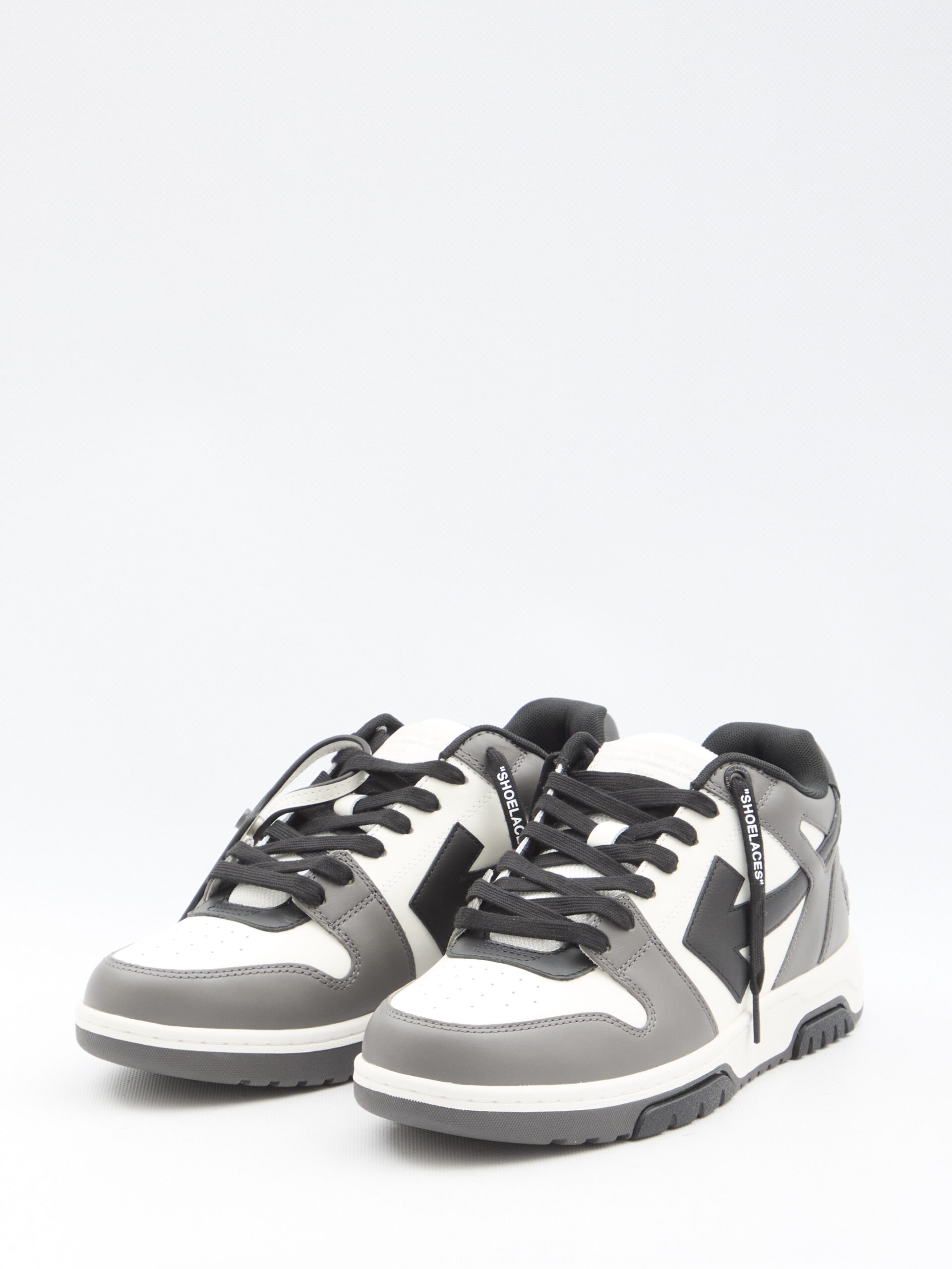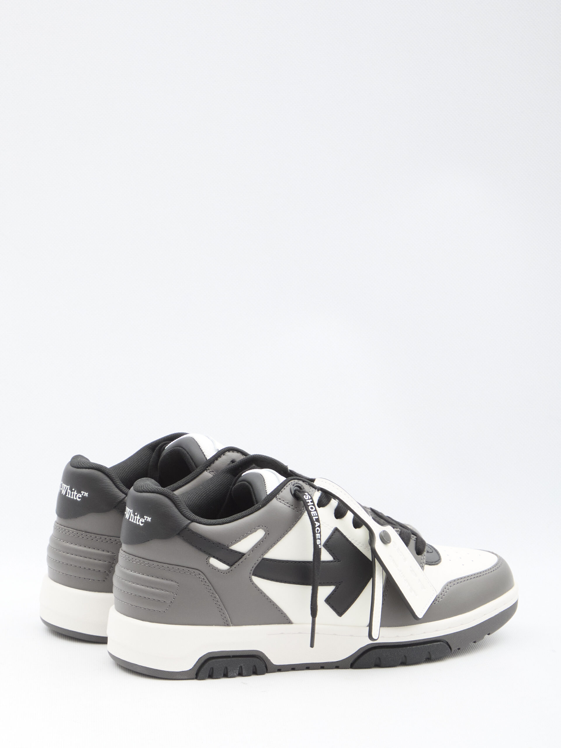 Out Of Office sneakers in white, dark grey and black leather. They feature round and perforated toe, logoed lace-up closure, side Arrow patch, detachable tag, embossed Off-White logo at the back and rubber sole. Dust bag included. Any leather imperfections are not to be considered manufacturing defects, but a peculiarity of the material.